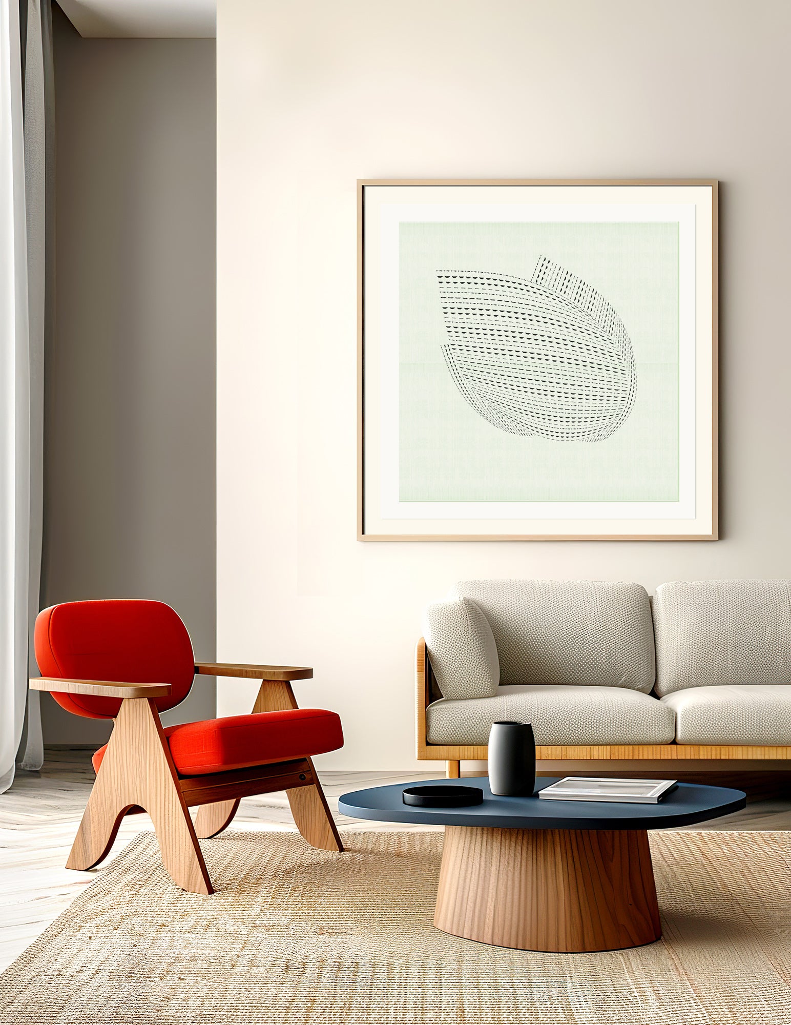 The image with the framed artwork is a simulation to provide a general sense of scale and framing options, suggesting a 10-15cm margin between the artwork and the frame, which could be achieved with a passpartout, or a foam on the background.