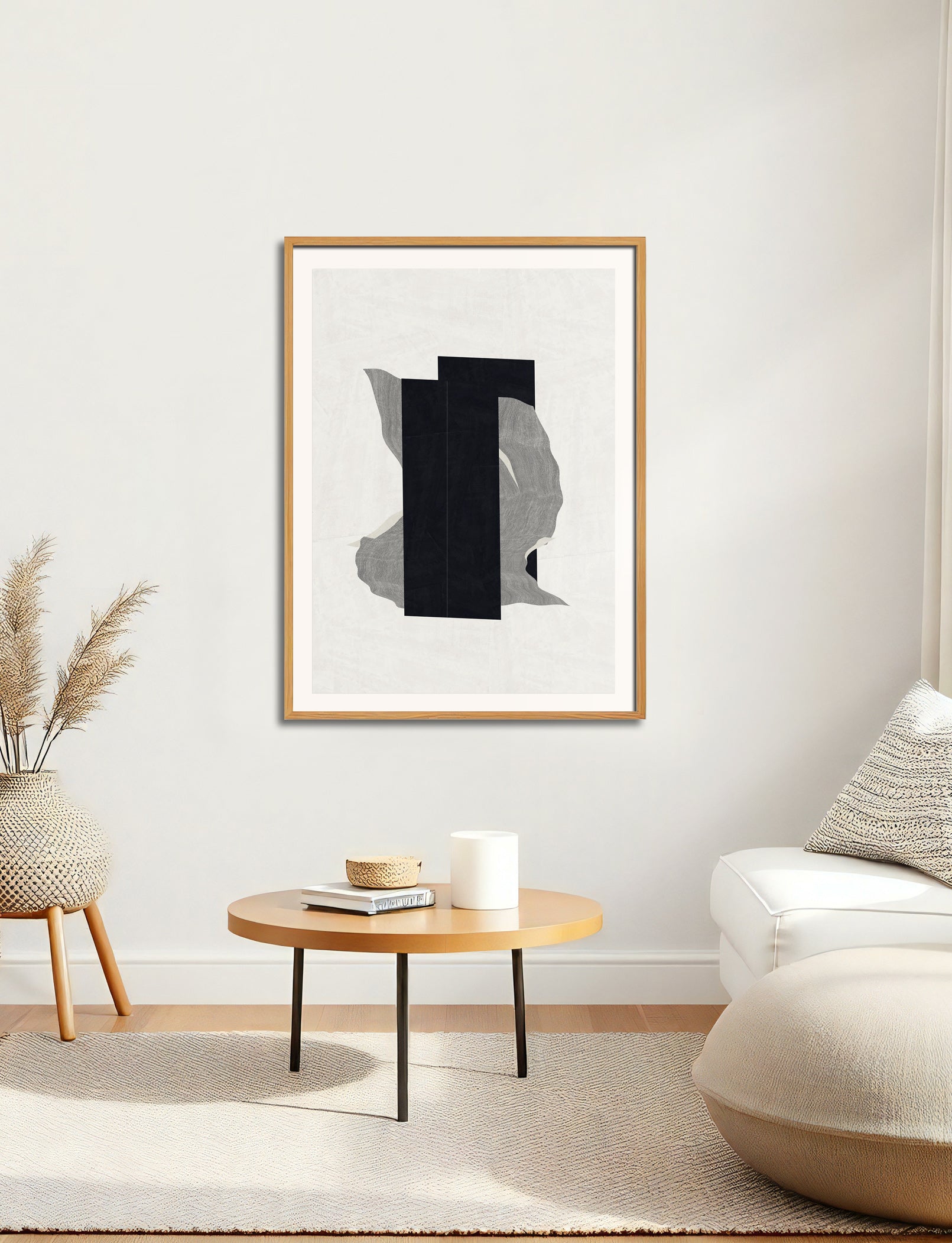 The image with the framed artwork is a simulation to provide a general sense of scale and framing options, suggesting a 10-15cm margin between the artwork and the frame, which could be achieved with a passpartout, or a foam on the background.