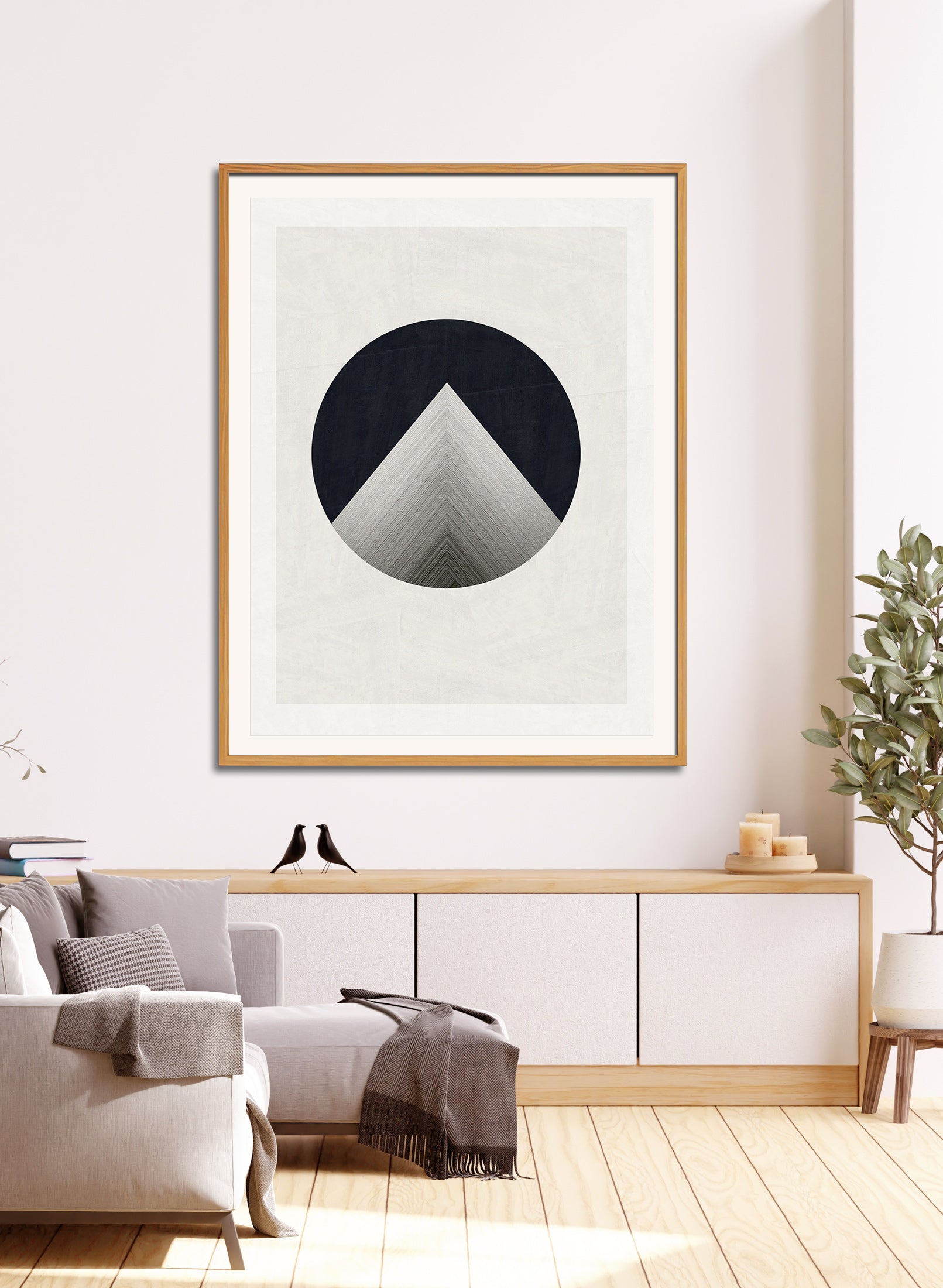 The image with the framed artwork is a simulation to provide a general sense of scale and framing options, suggesting a 10-15cm margin between the artwork and the frame, which could be achieved with a passpartout, or a foam on the background.