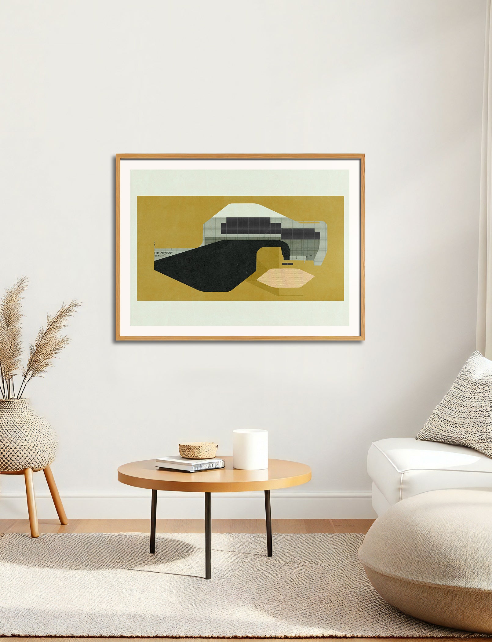 The image with the framed artwork is a simulation to provide a general sense of scale and framing options, suggesting a 10-15cm margin between the artwork and the frame, which could be achieved with a passpartout, or a foam on the background.