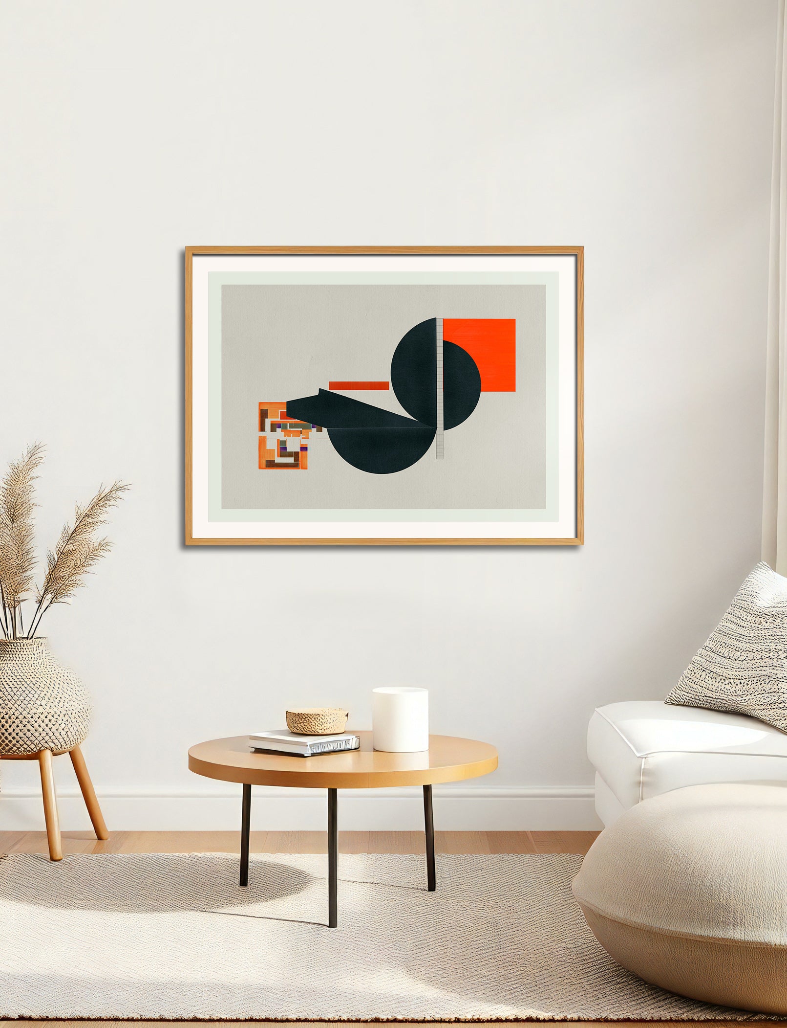 The image with the framed artwork is a simulation to provide a general sense of scale and framing options, suggesting a 10-15cm margin between the artwork and the frame, which could be achieved with a passpartout, or a foam on the background.