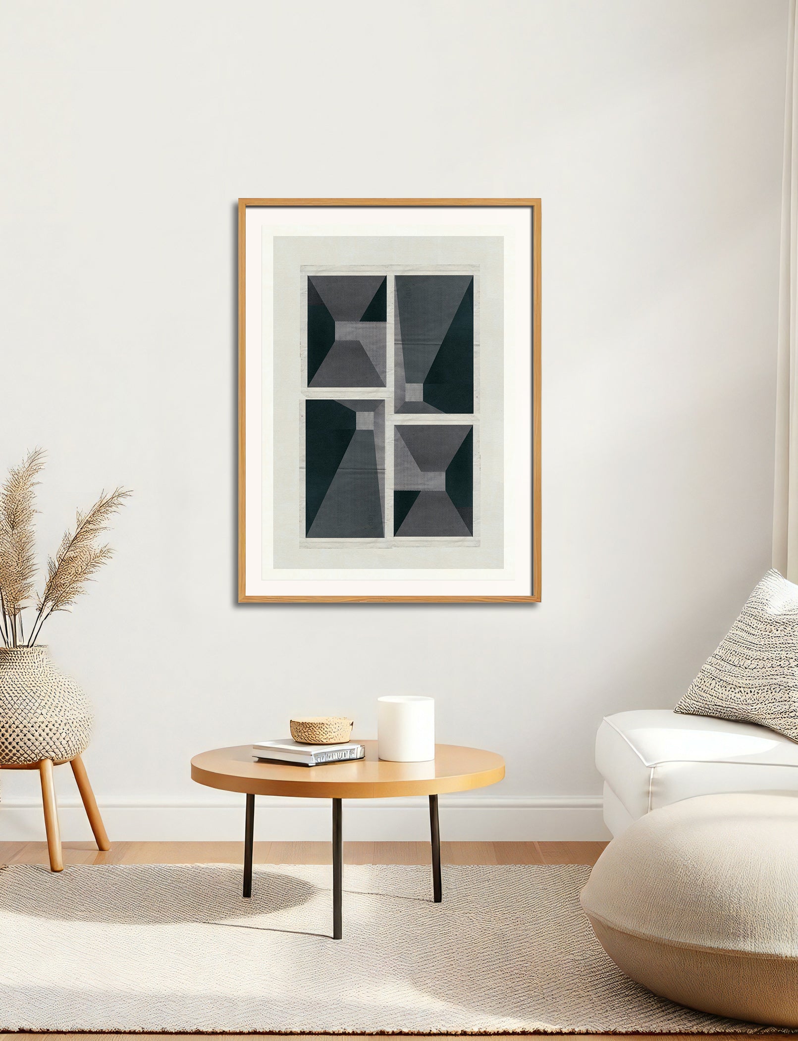The image with the framed artwork is a simulation to provide a general sense of scale and framing options, suggesting a 10-15cm margin between the artwork and the frame, which could be achieved with a passpartout, or a foam on the background.