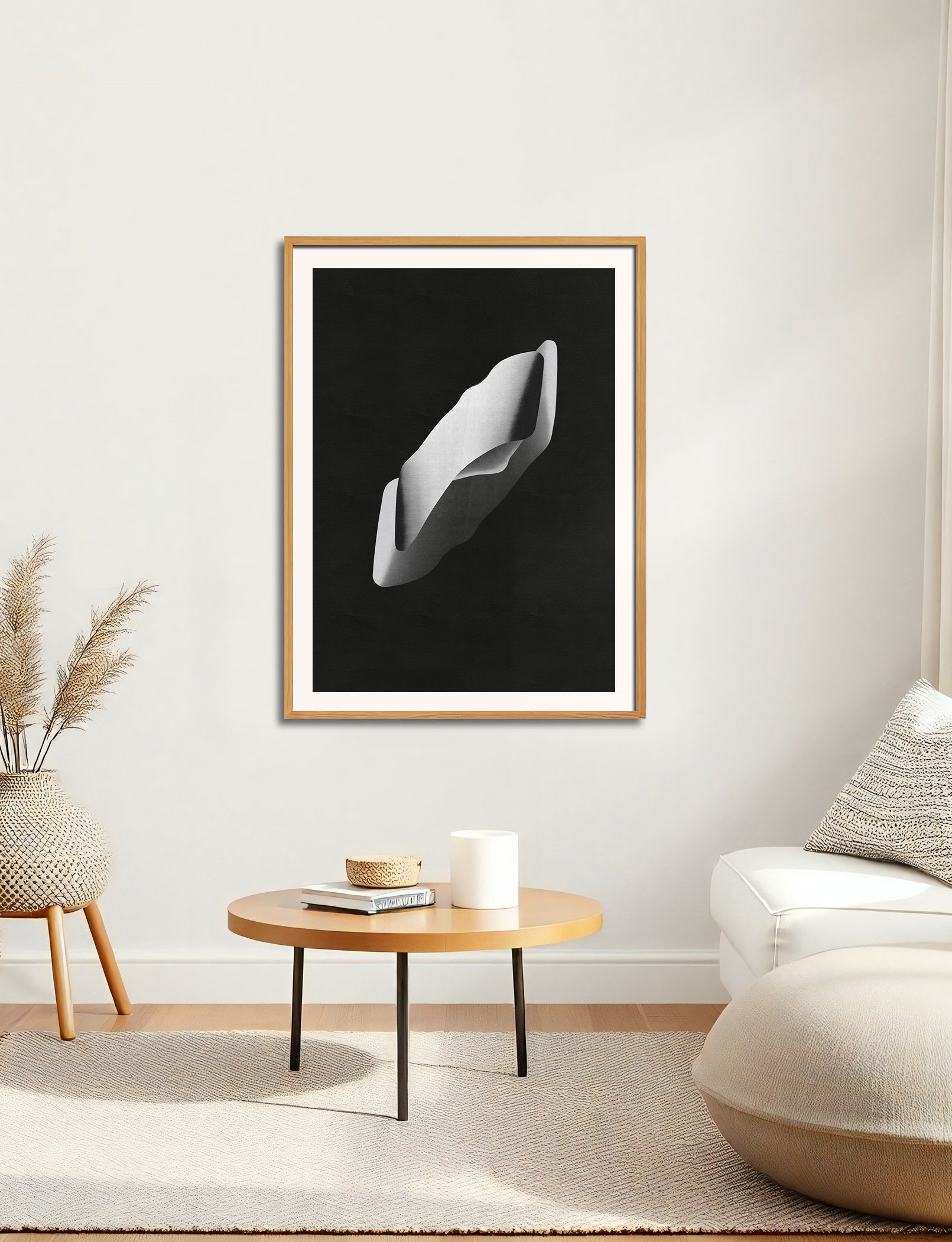 The image with the framed artwork is a simulation to provide a general sense of scale and framing options, suggesting a 10-15cm margin between the artwork and the frame, which could be achieved with a passpartout, or a foam on the background.