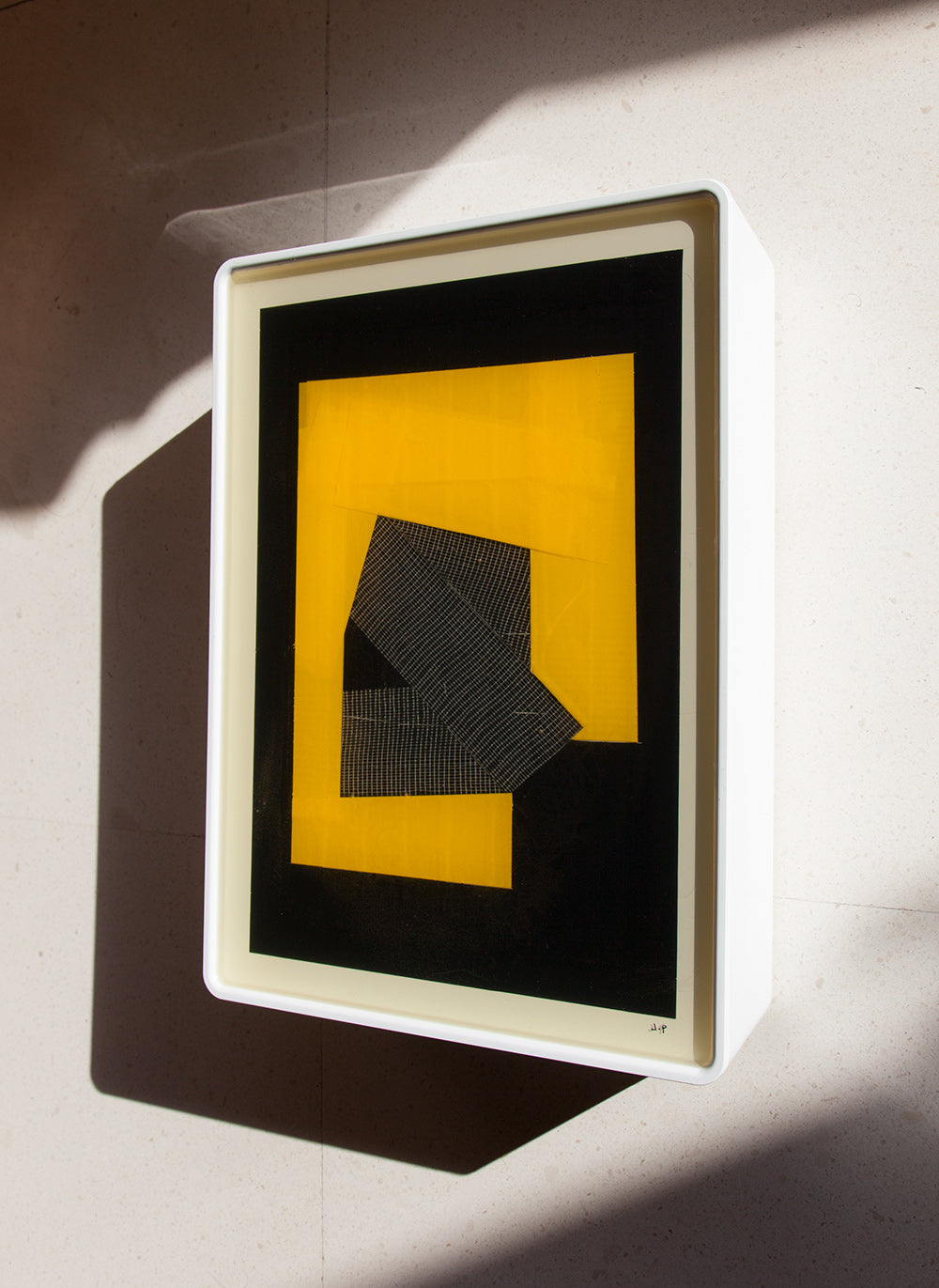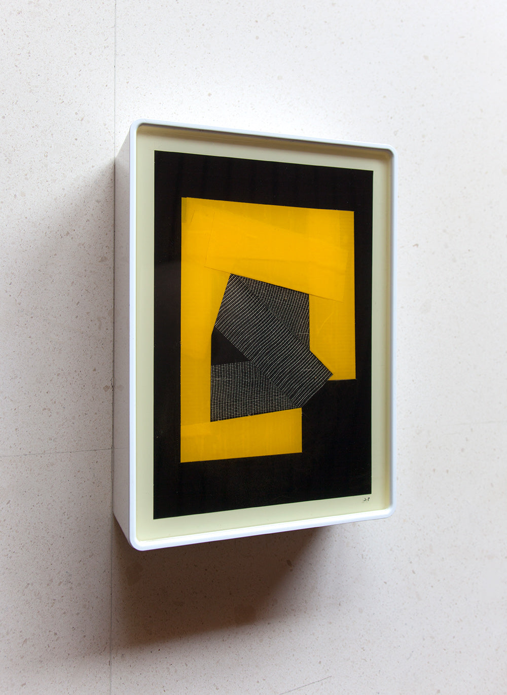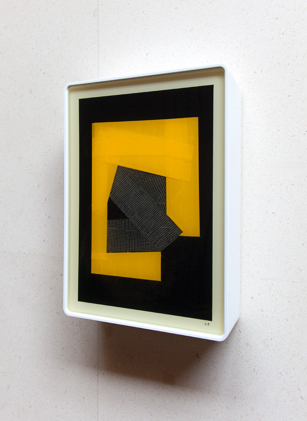A series of artworks created using Ikea PVC boxes as a support, exploring a variety of mixed media techniques that combine collage, ink drawing, and resin. The resin is used both to seal the composition and to create subtle layers of depth, often resulting in irregular and imperfect finishes that embrace the experimental nature of the medium.