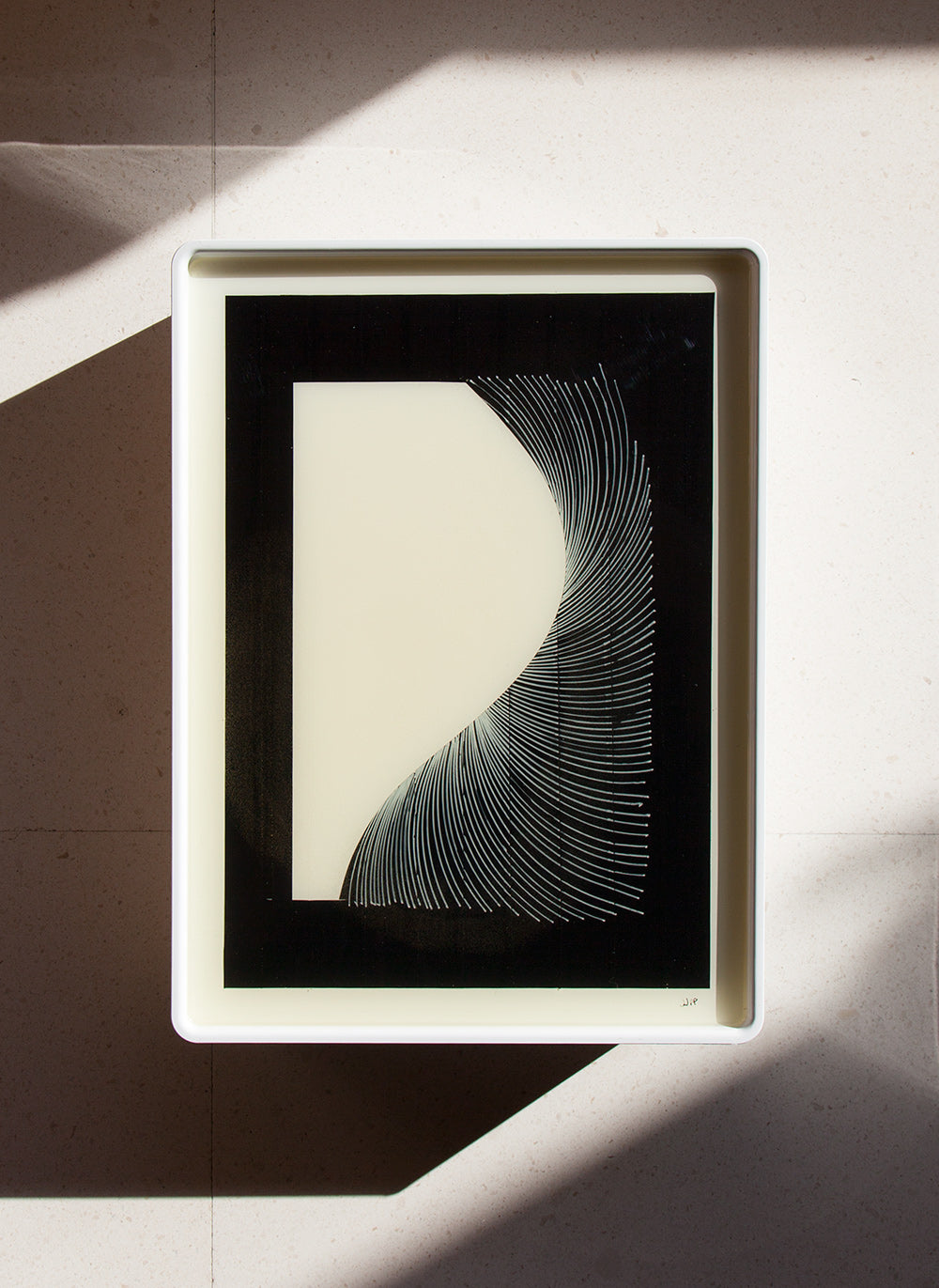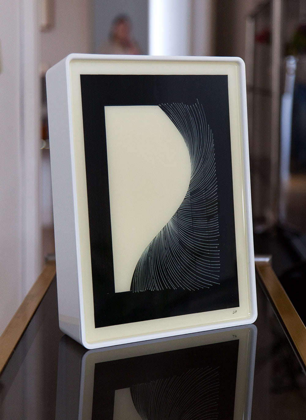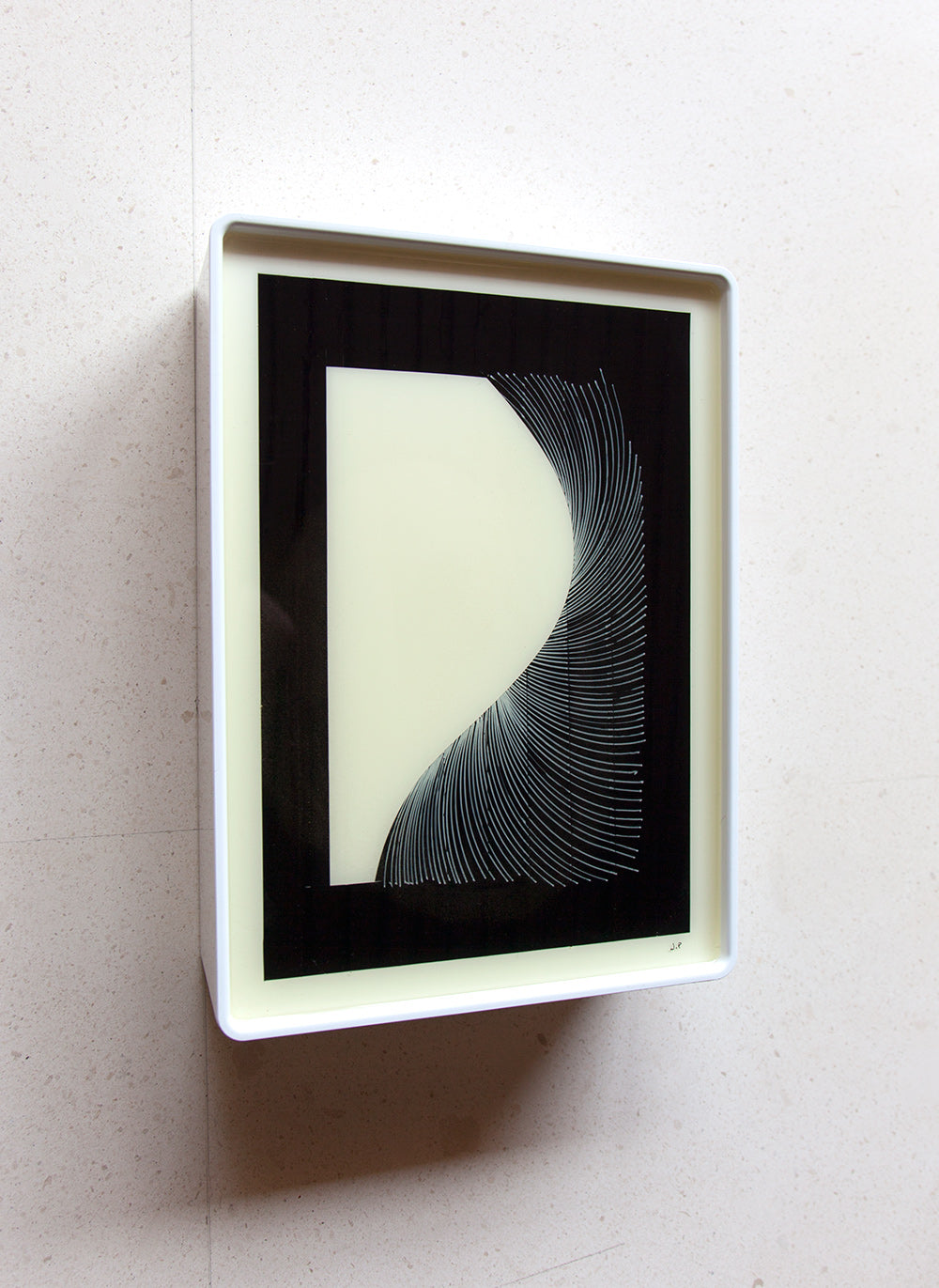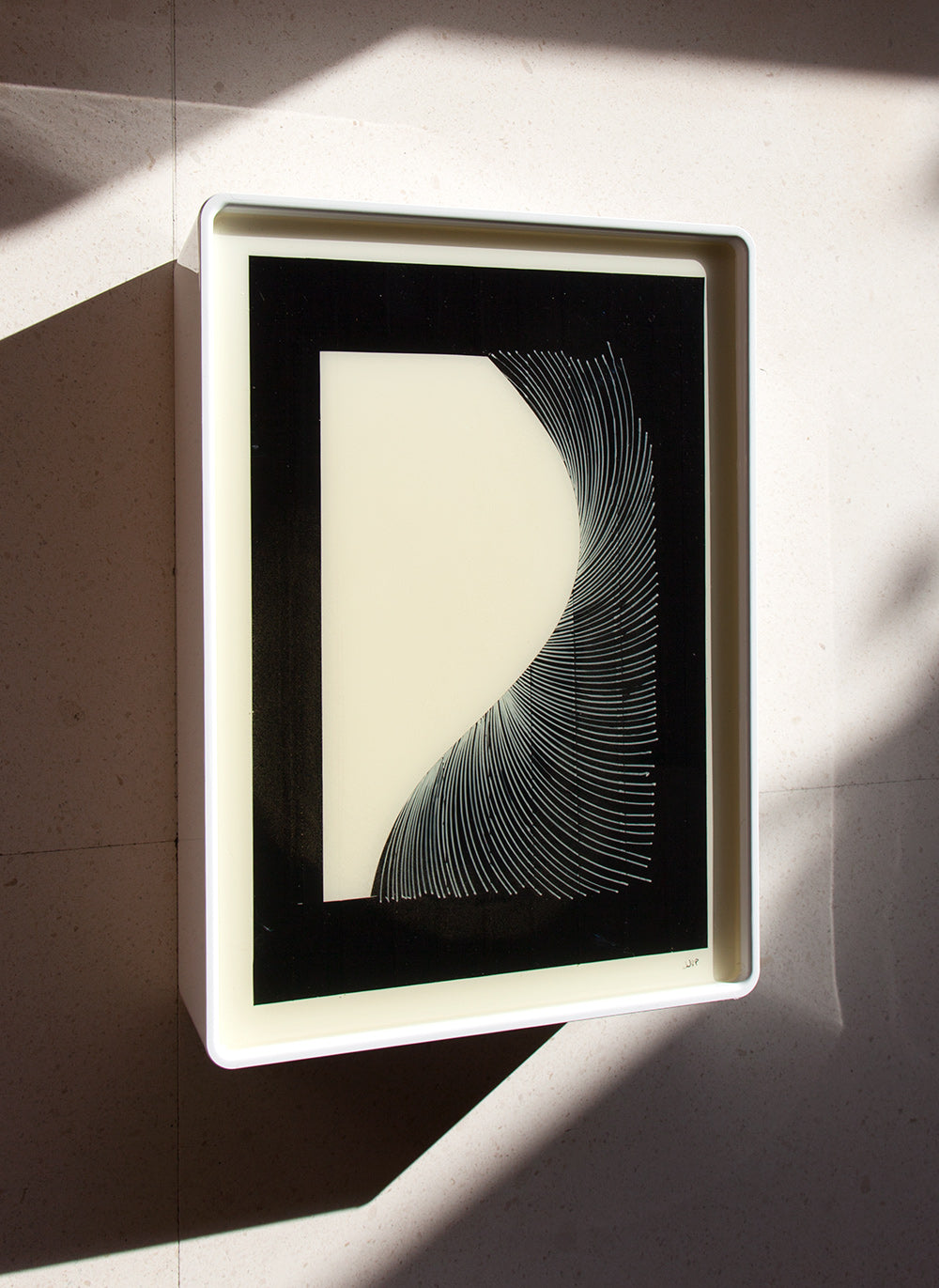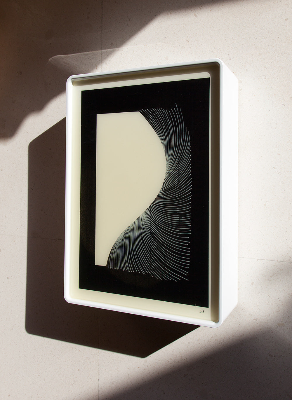 The pieces are designed to be both wall-mounted and free-standing, with the box's unique shape allowing for a gentle incline that enhances the viewing experience.