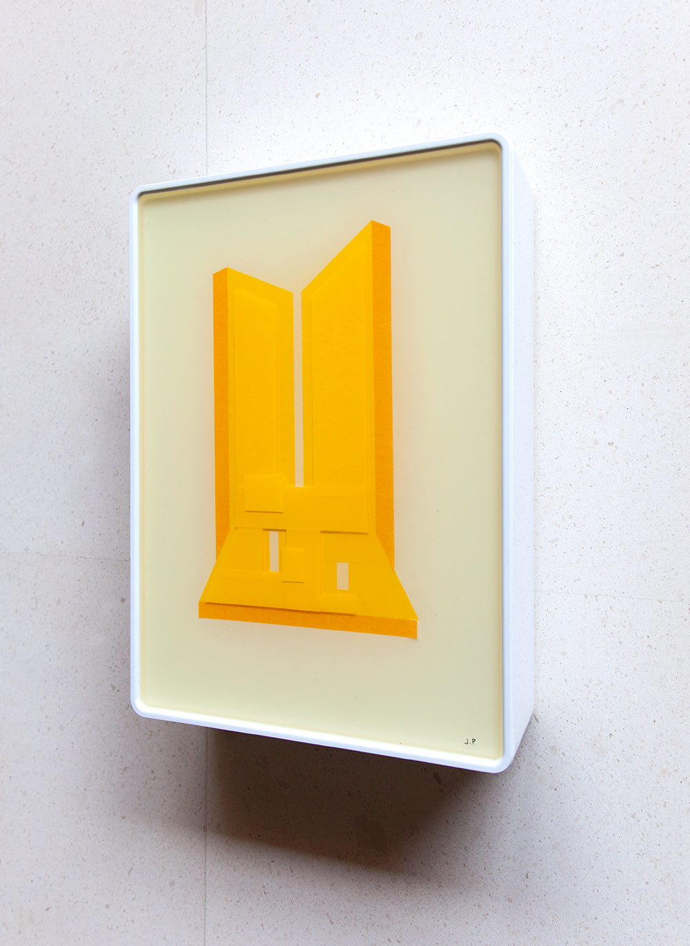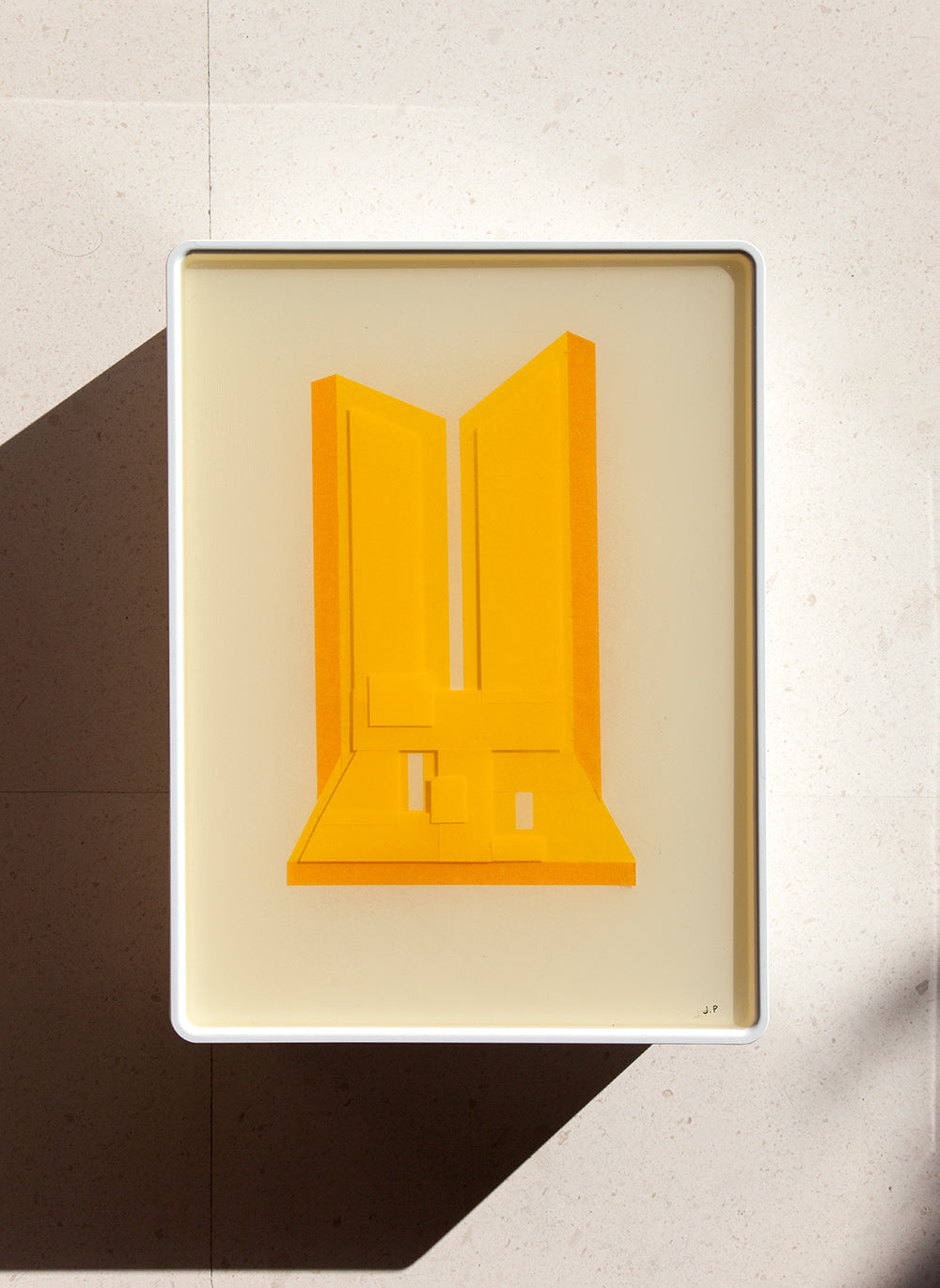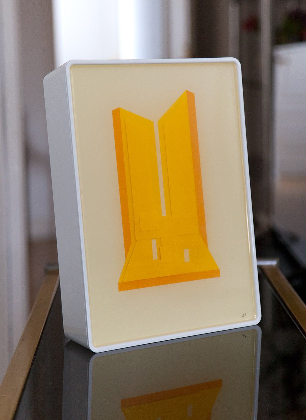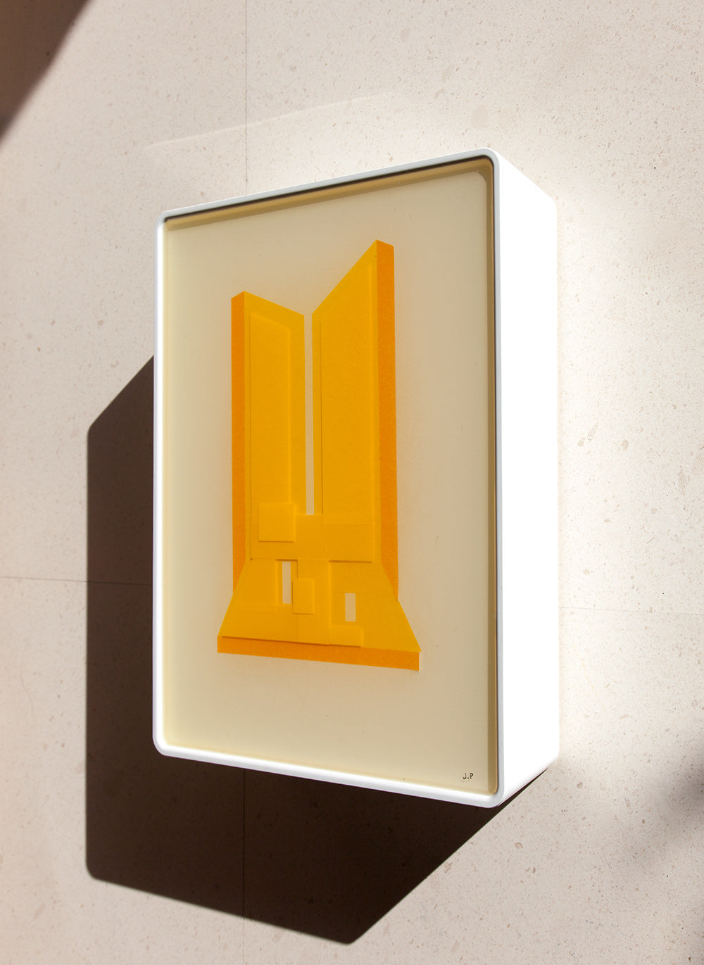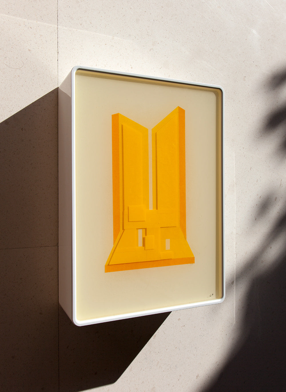 The pieces are designed to be both wall-mounted and free-standing, with the box's unique shape allowing for a gentle incline that enhances the viewing experience.