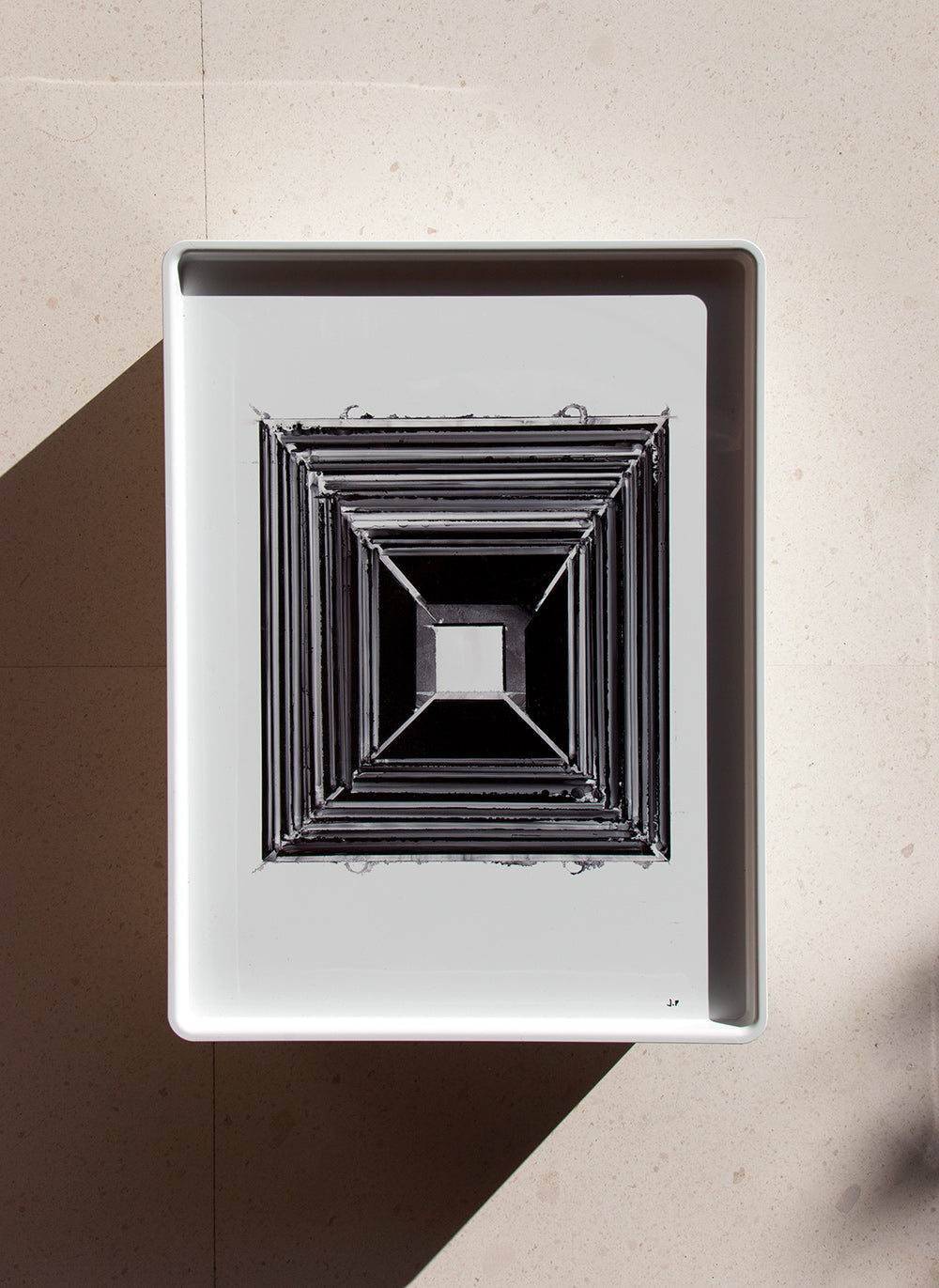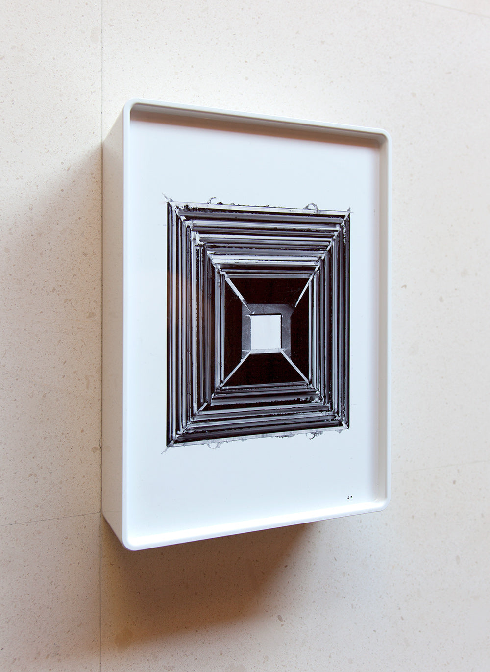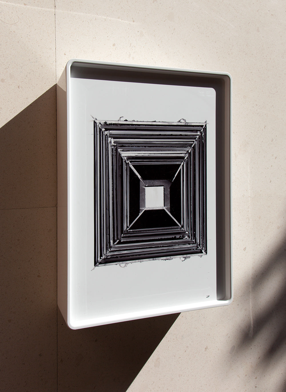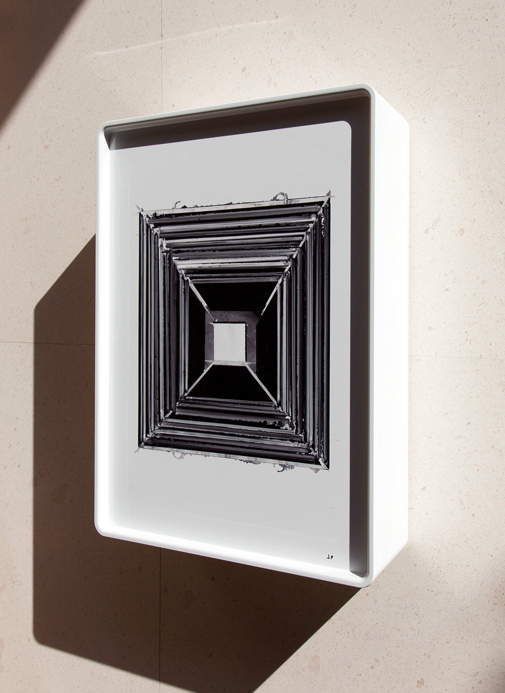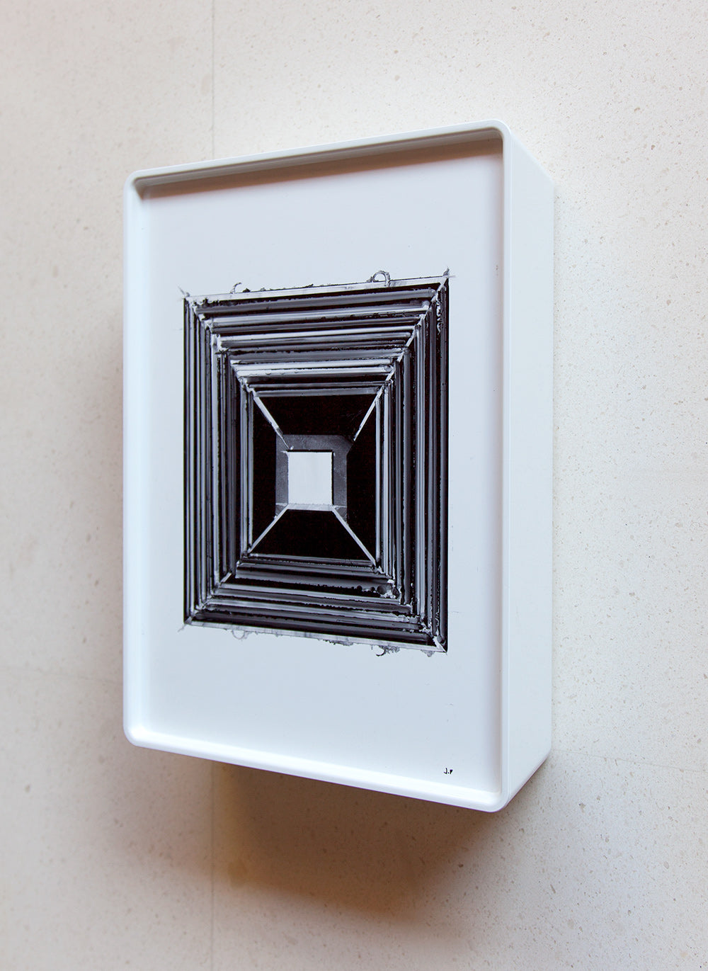 A series of artworks created using Ikea PVC boxes as a support, exploring a variety of mixed media techniques that combine collage, ink drawing, and resin. The resin is used both to seal the composition and to create subtle layers of depth, often resulting in irregular and imperfect finishes that embrace the experimental nature of the medium.