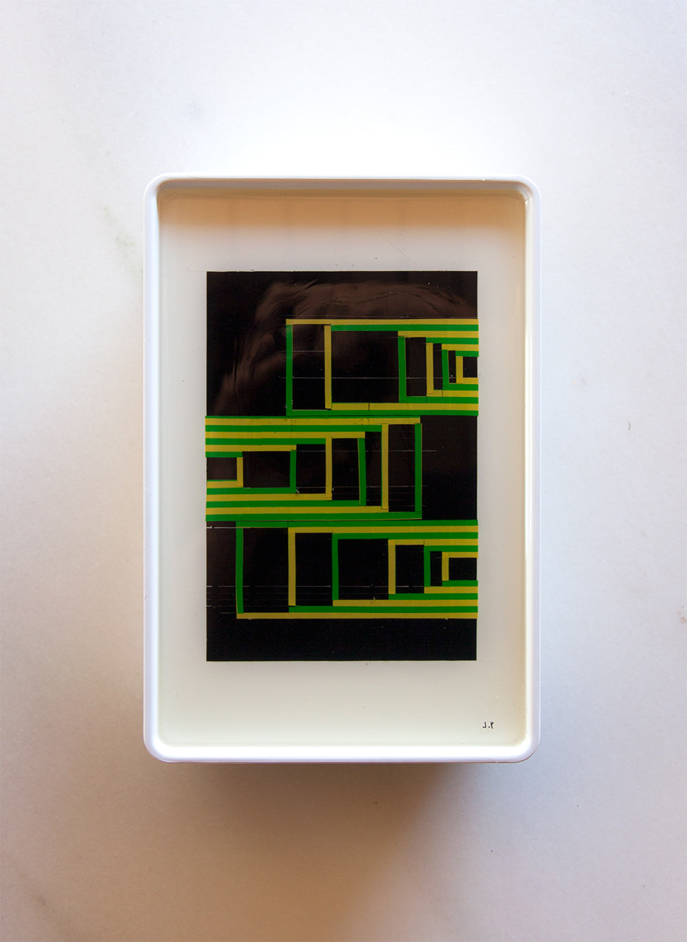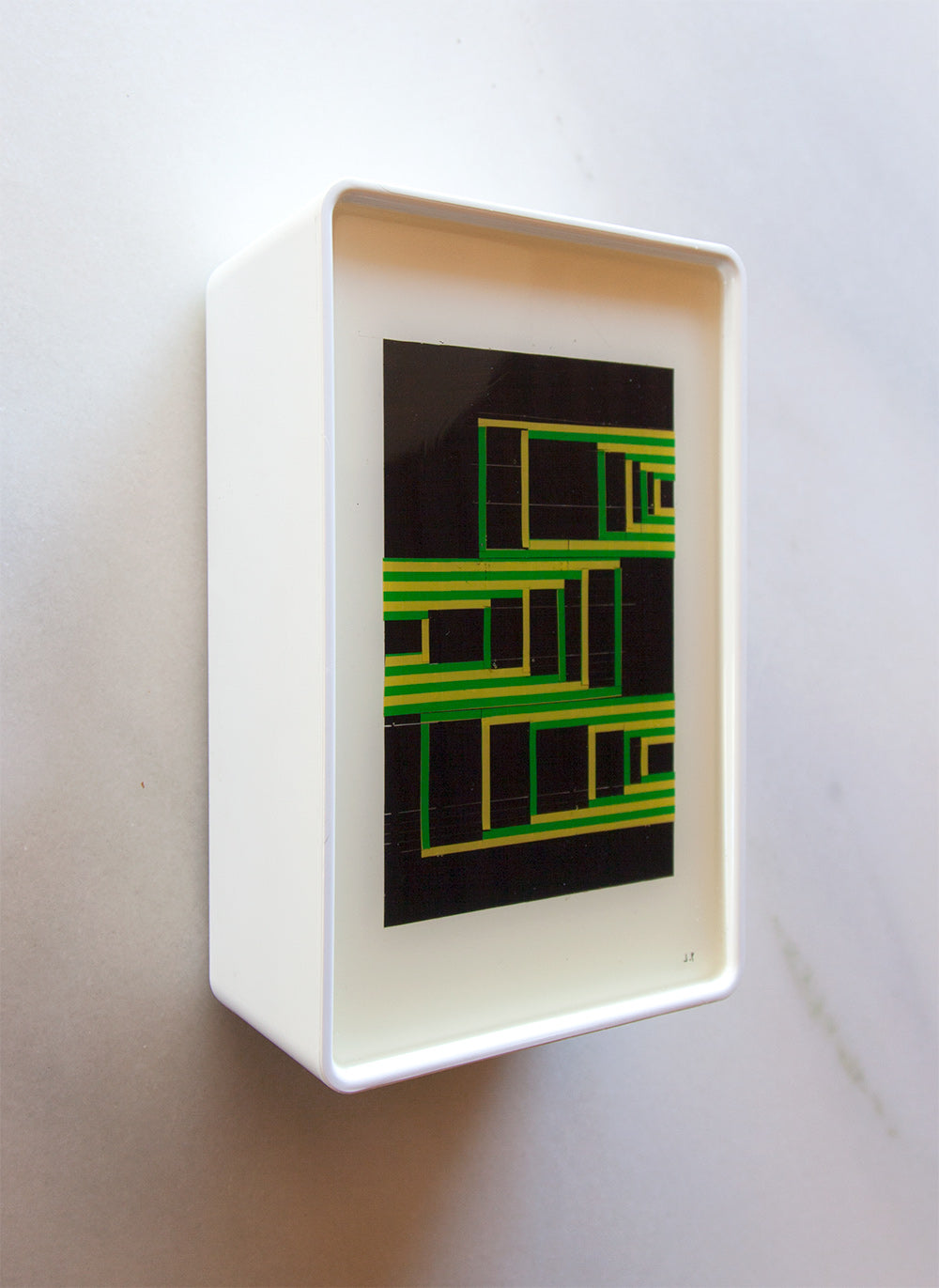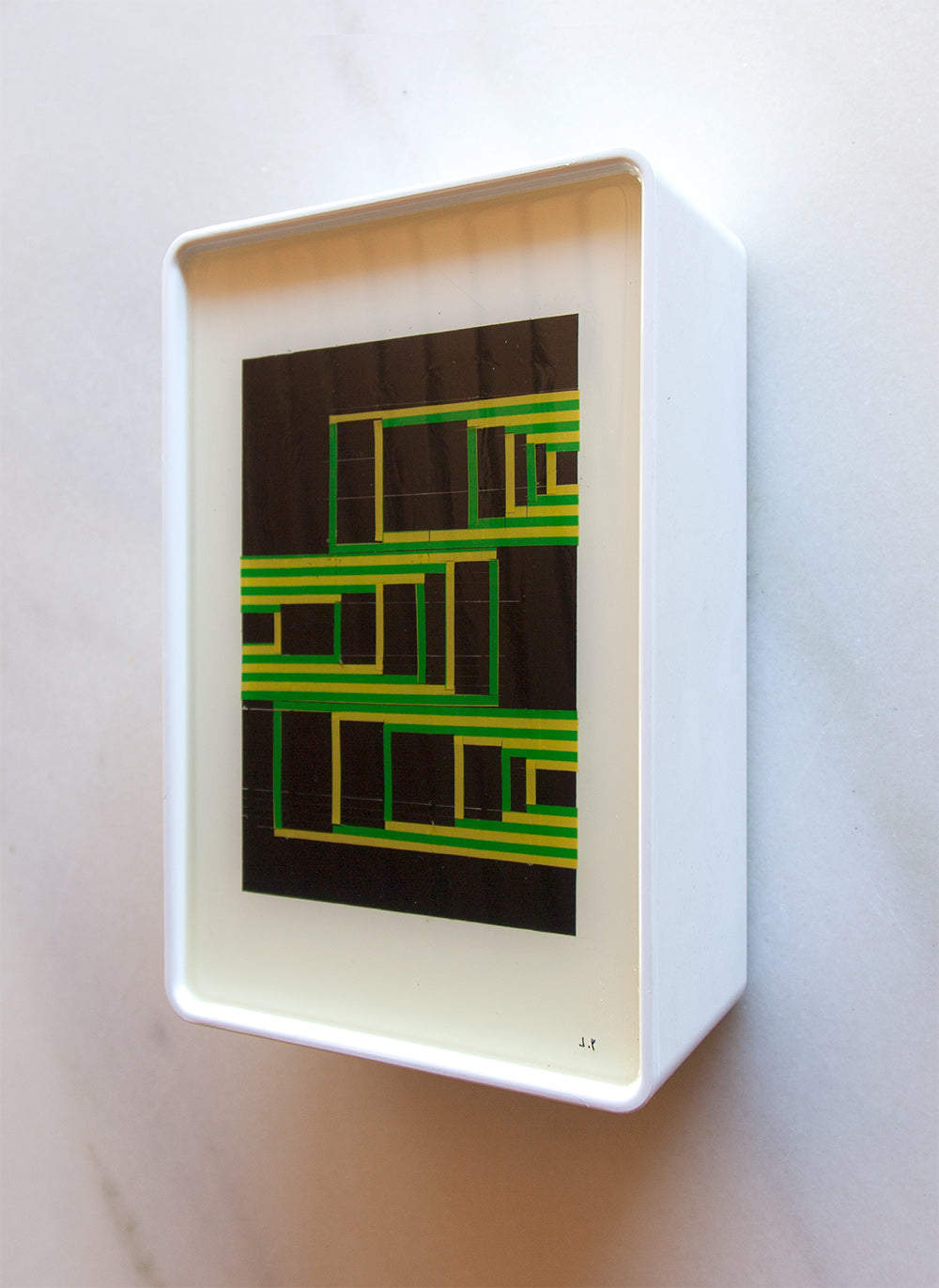 A series of artworks created using Ikea PVC boxes as a support, exploring a variety of mixed media techniques that combine collage, ink drawing, and resin. The resin is used both to seal the composition and to create subtle layers of depth, often resulting in irregular and imperfect finishes that embrace the experimental nature of the medium.