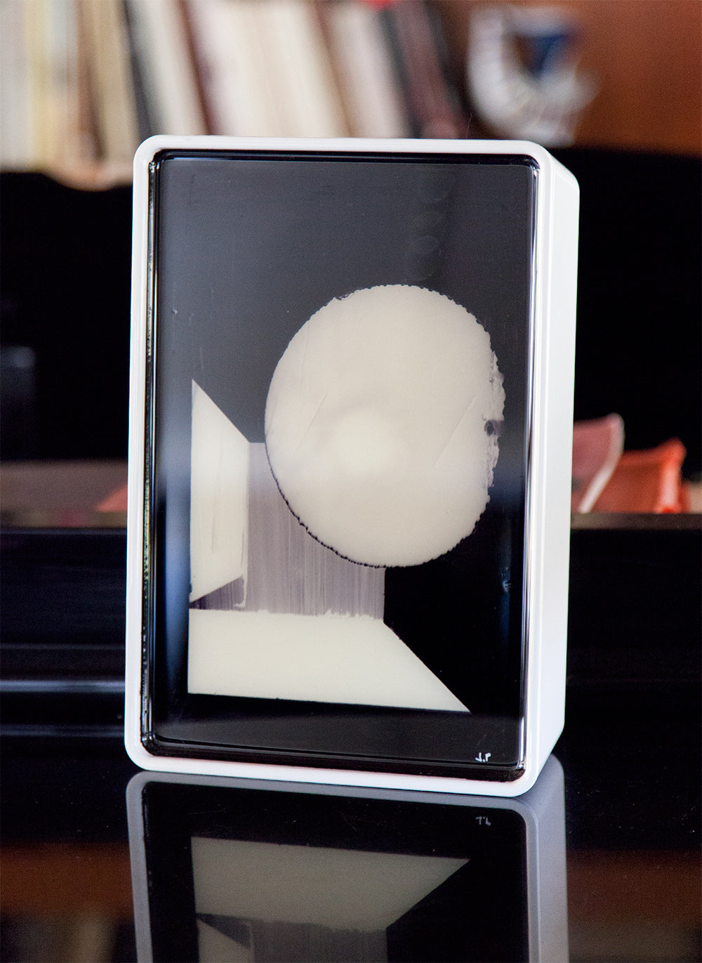 The pieces are designed to be both wall-mounted and free-standing, with the box's unique shape allowing for a gentle incline that enhances the viewing experience.