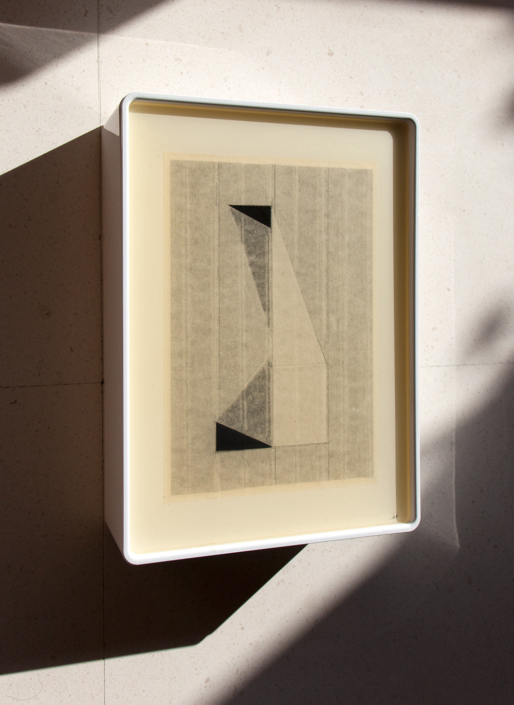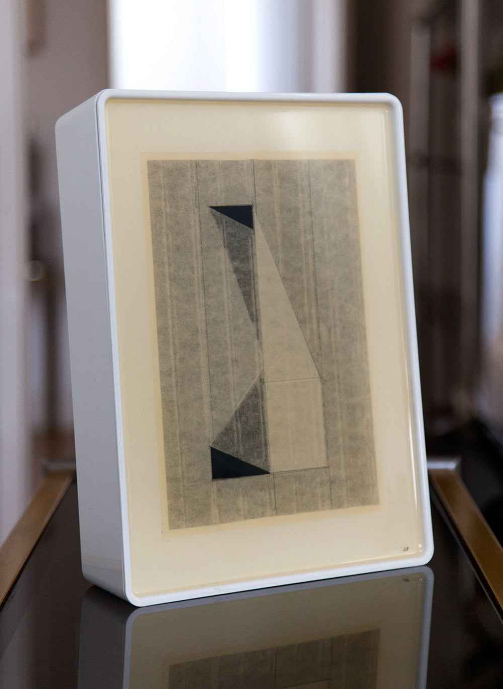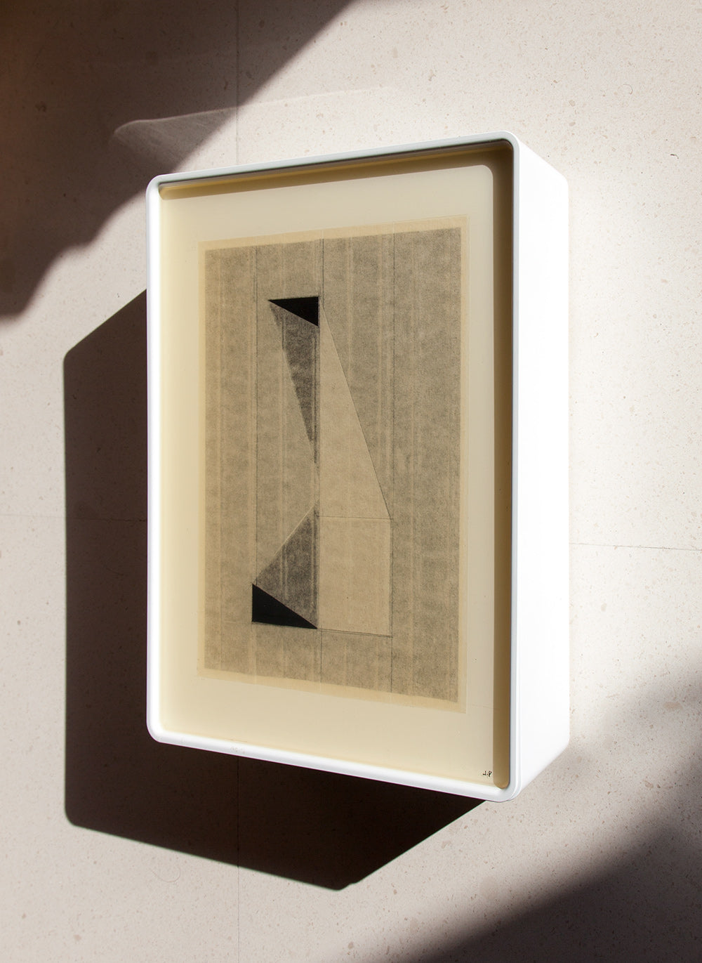 The pieces are designed to be both wall-mounted and free-standing, with the box's unique shape allowing for a gentle incline that enhances the viewing experience.