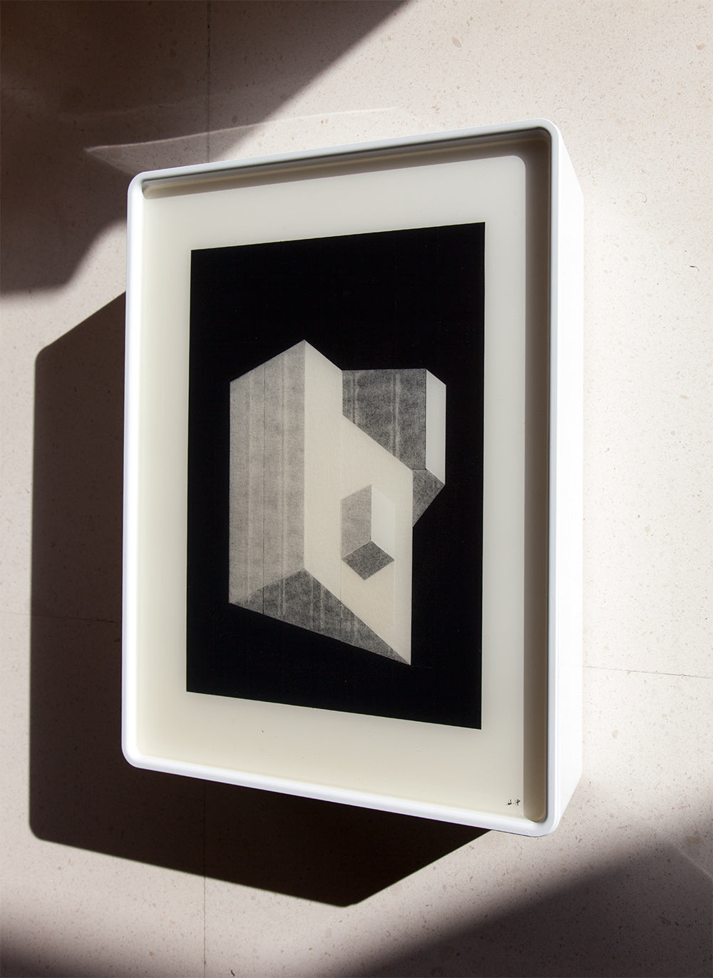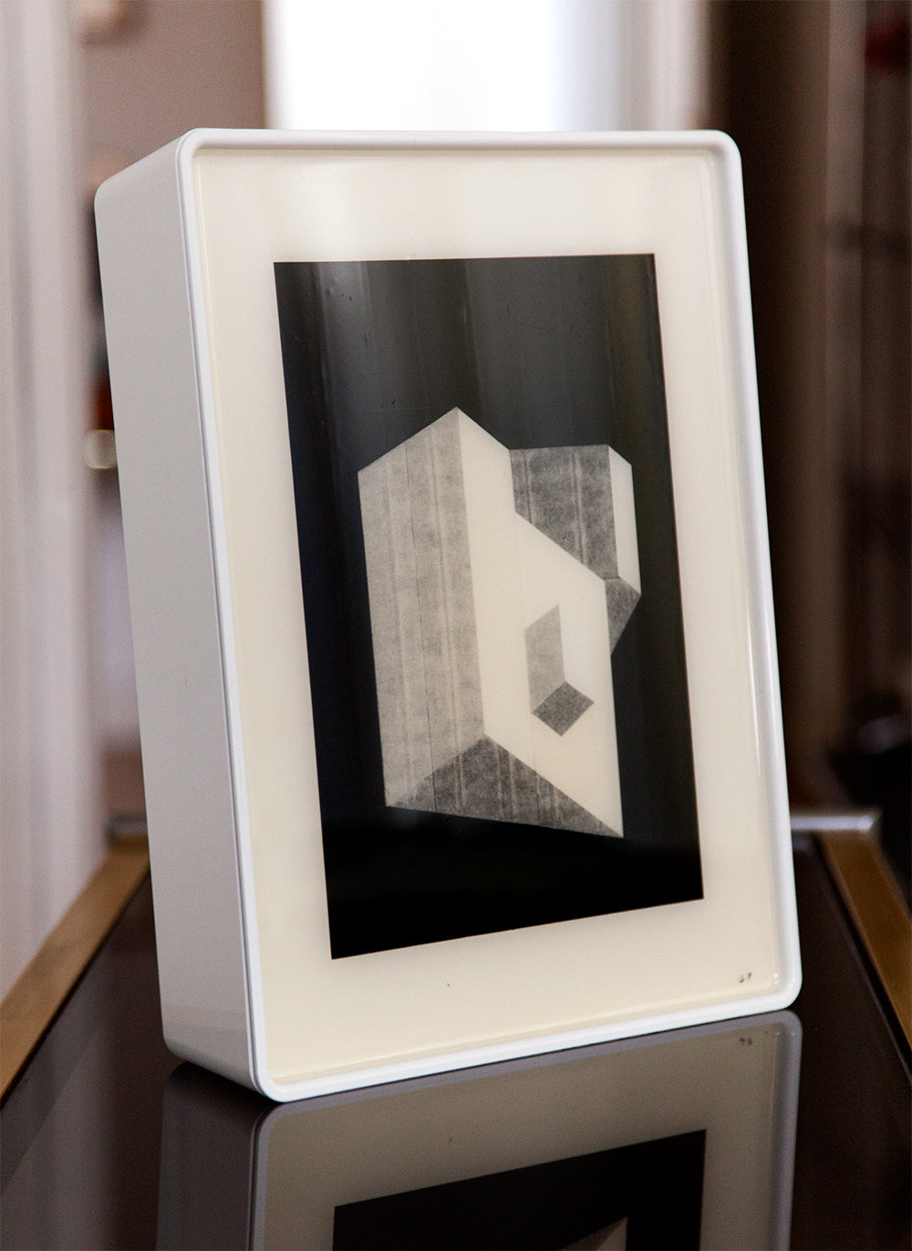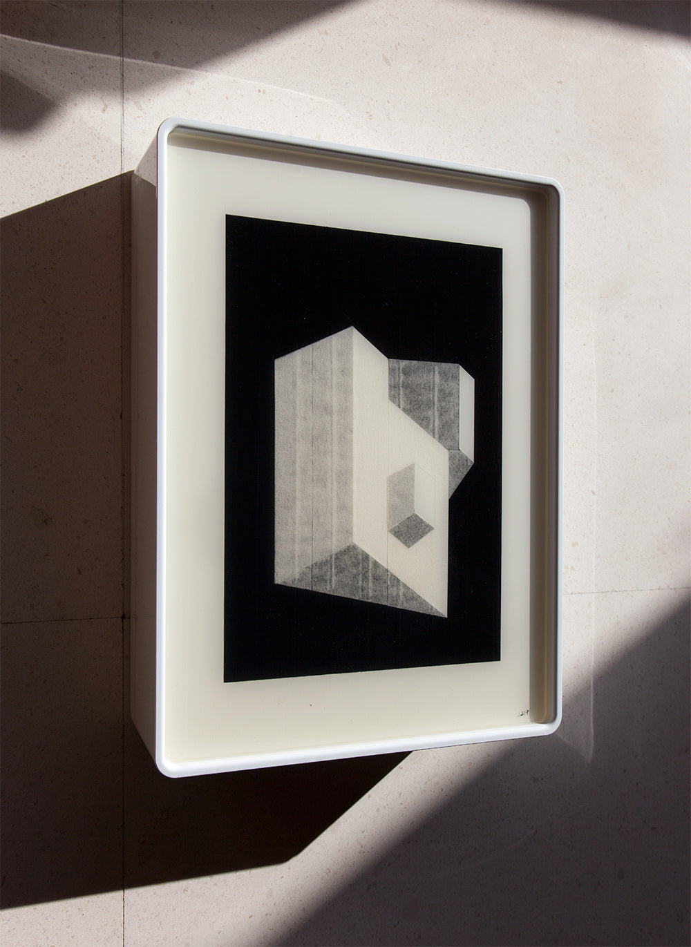 The pieces are designed to be both wall-mounted and free-standing, with the box's unique shape allowing for a gentle incline that enhances the viewing experience.