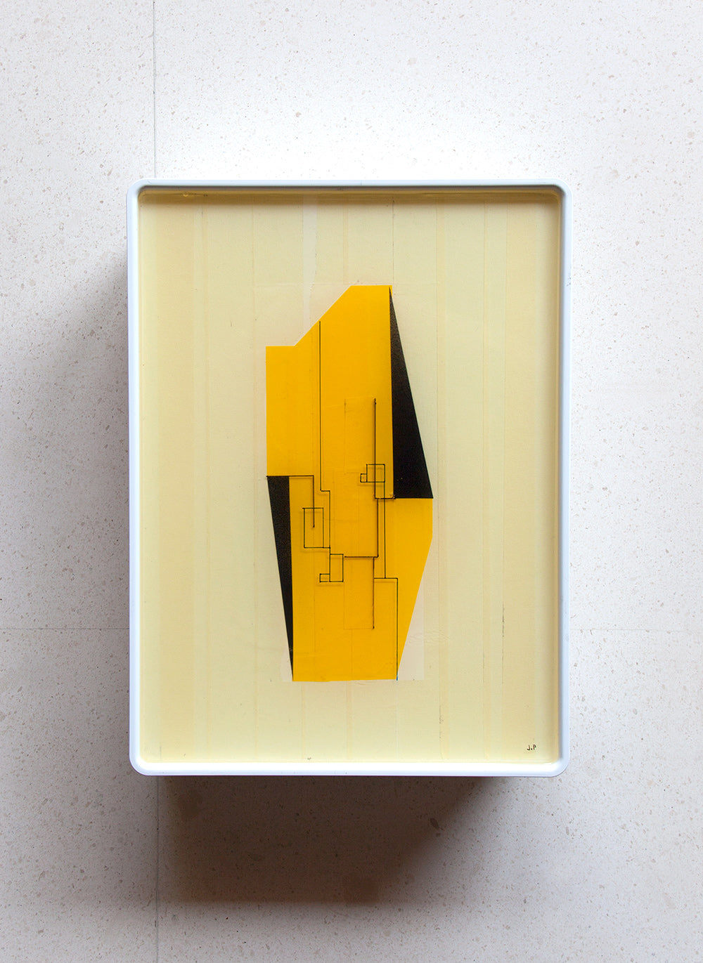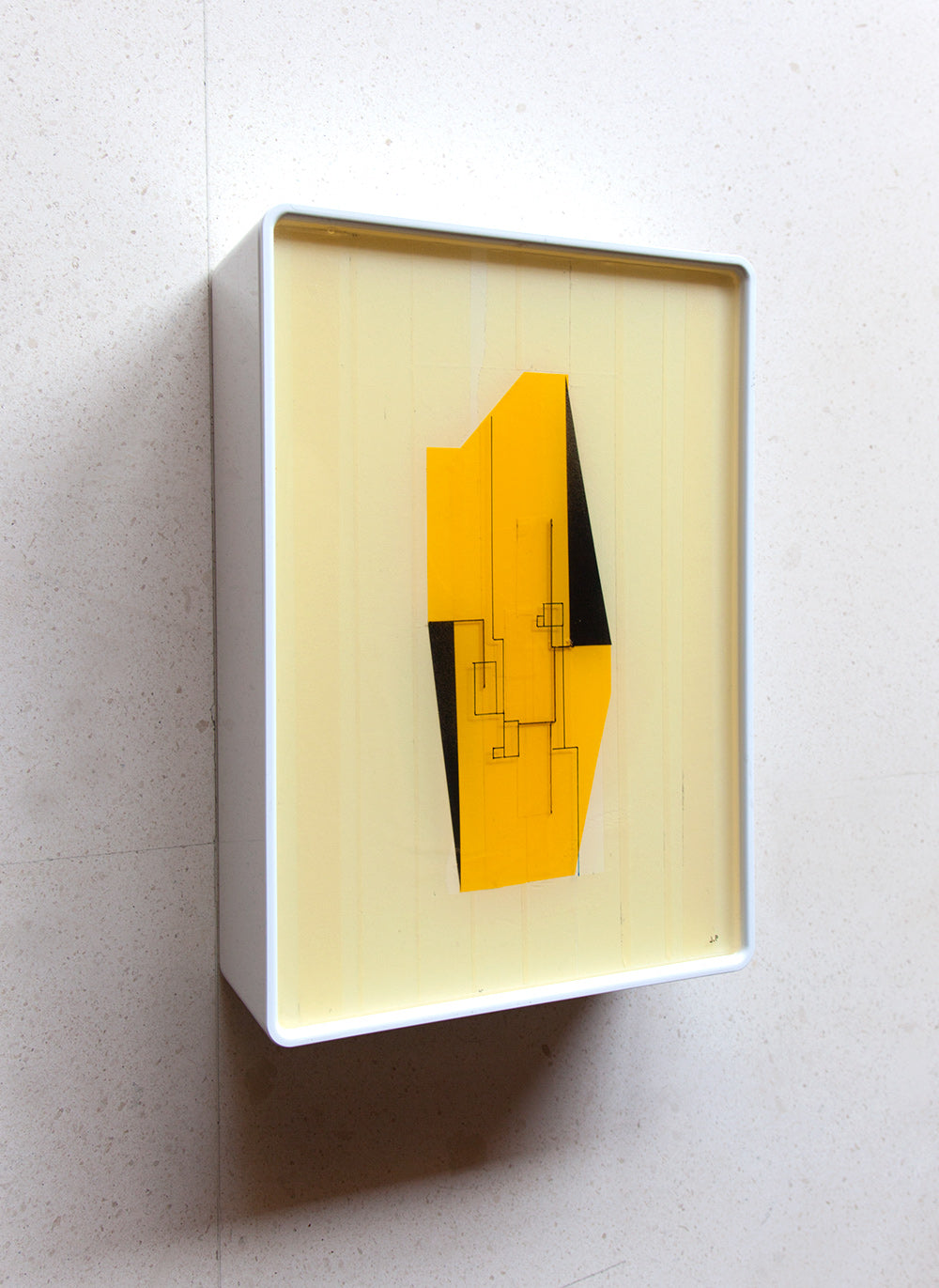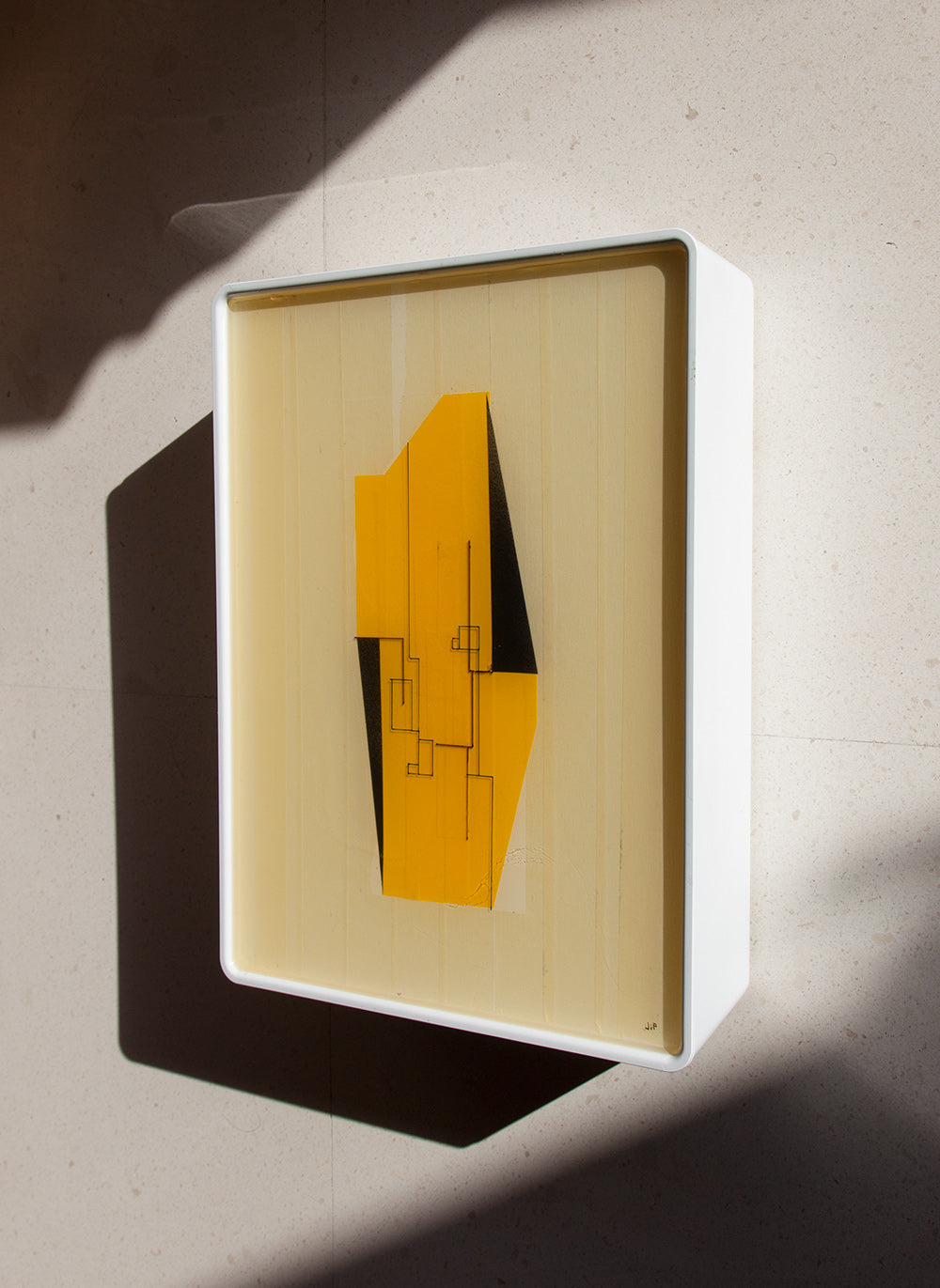 A series of artworks created using Ikea PVC boxes as a support, exploring a variety of mixed media techniques that combine collage, ink drawing, and resin. The resin is used both to seal the composition and to create subtle layers of depth, often resulting in irregular and imperfect finishes that embrace the experimental nature of the medium.