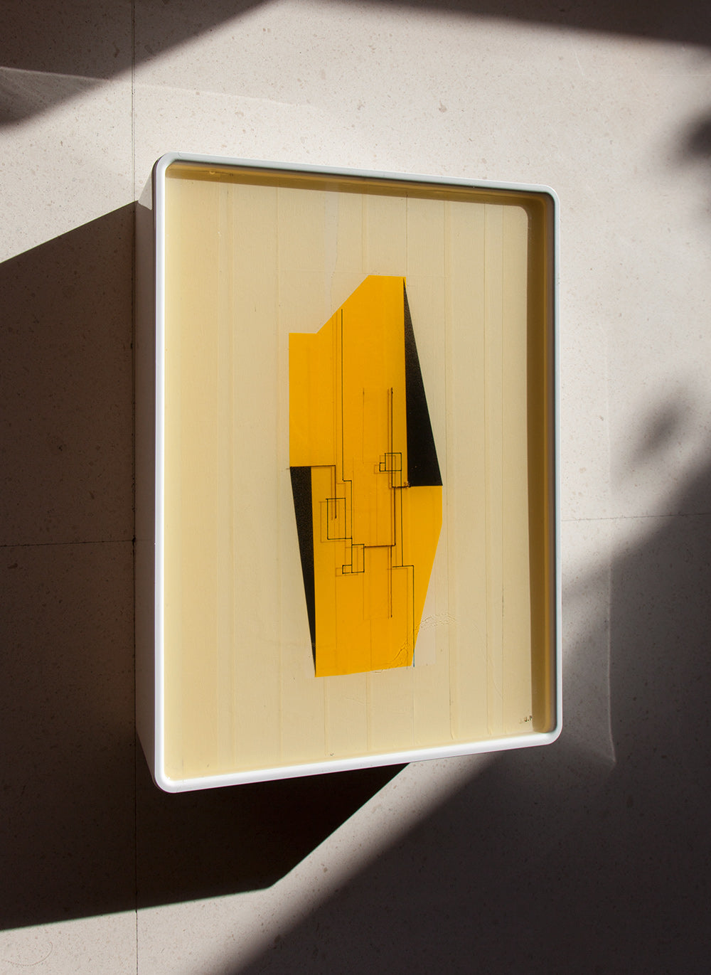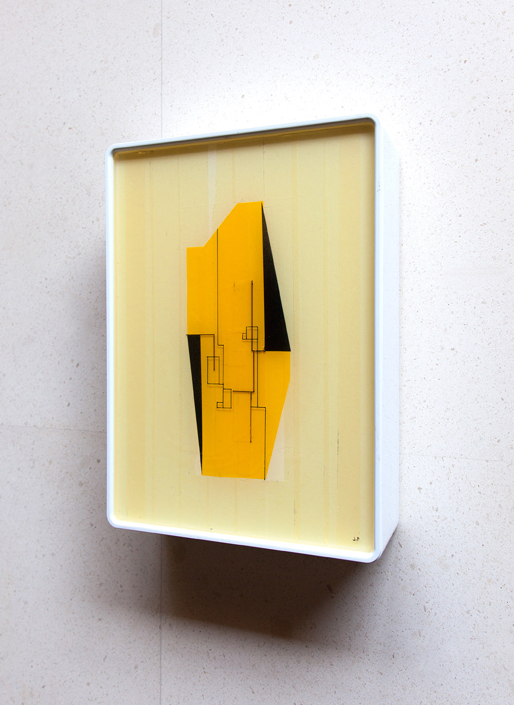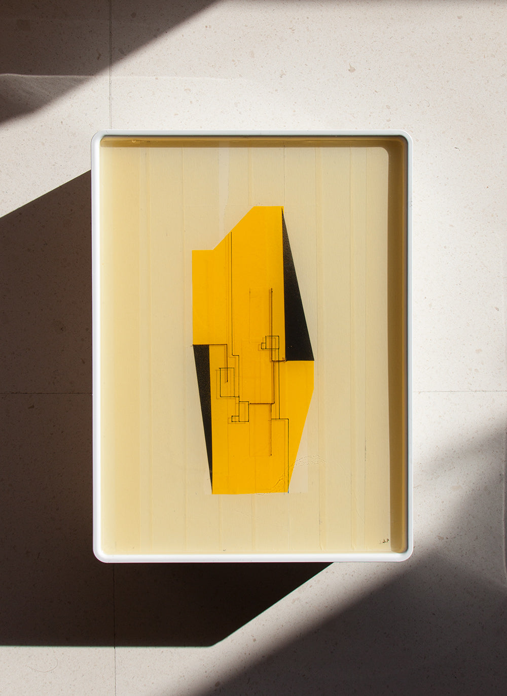 A series of artworks created using Ikea PVC boxes as a support, exploring a variety of mixed media techniques that combine collage, ink drawing, and resin. The resin is used both to seal the composition and to create subtle layers of depth, often resulting in irregular and imperfect finishes that embrace the experimental nature of the medium.