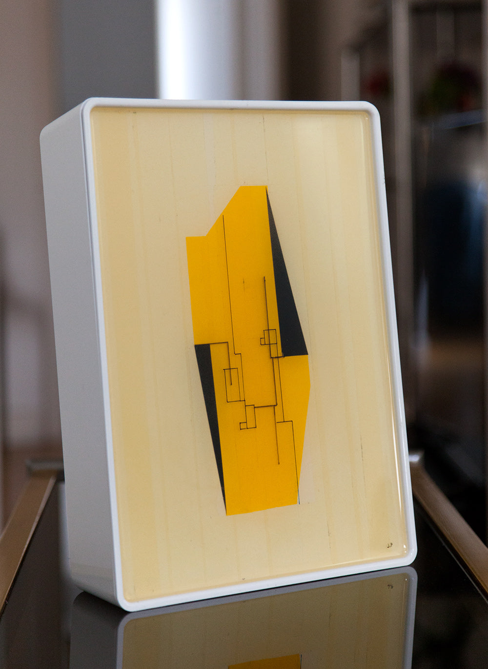 The pieces are designed to be both wall-mounted and free-standing, with the box's unique shape allowing for a gentle incline that enhances the viewing experience.