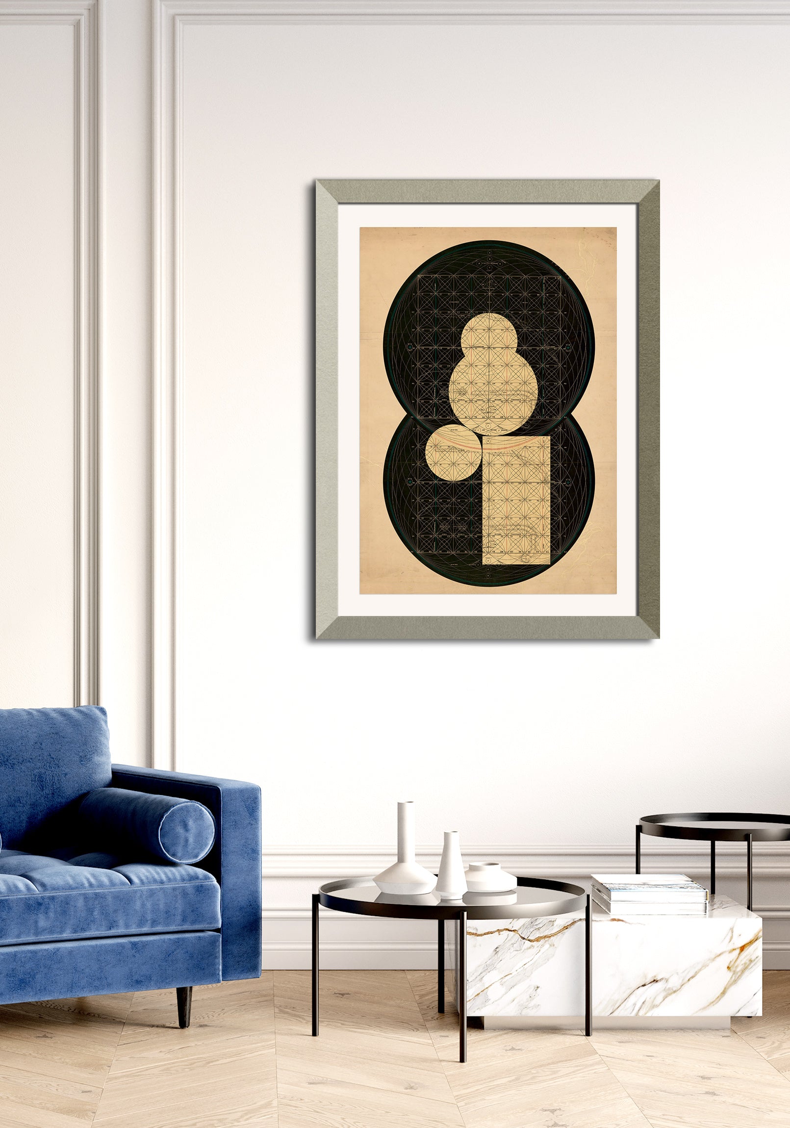 The image with the framed artwork is a simulation to provide a general sense of scale and framing options, suggesting a 10-15cm margin between the artwork and the frame, which could be achieved with a passepartout.