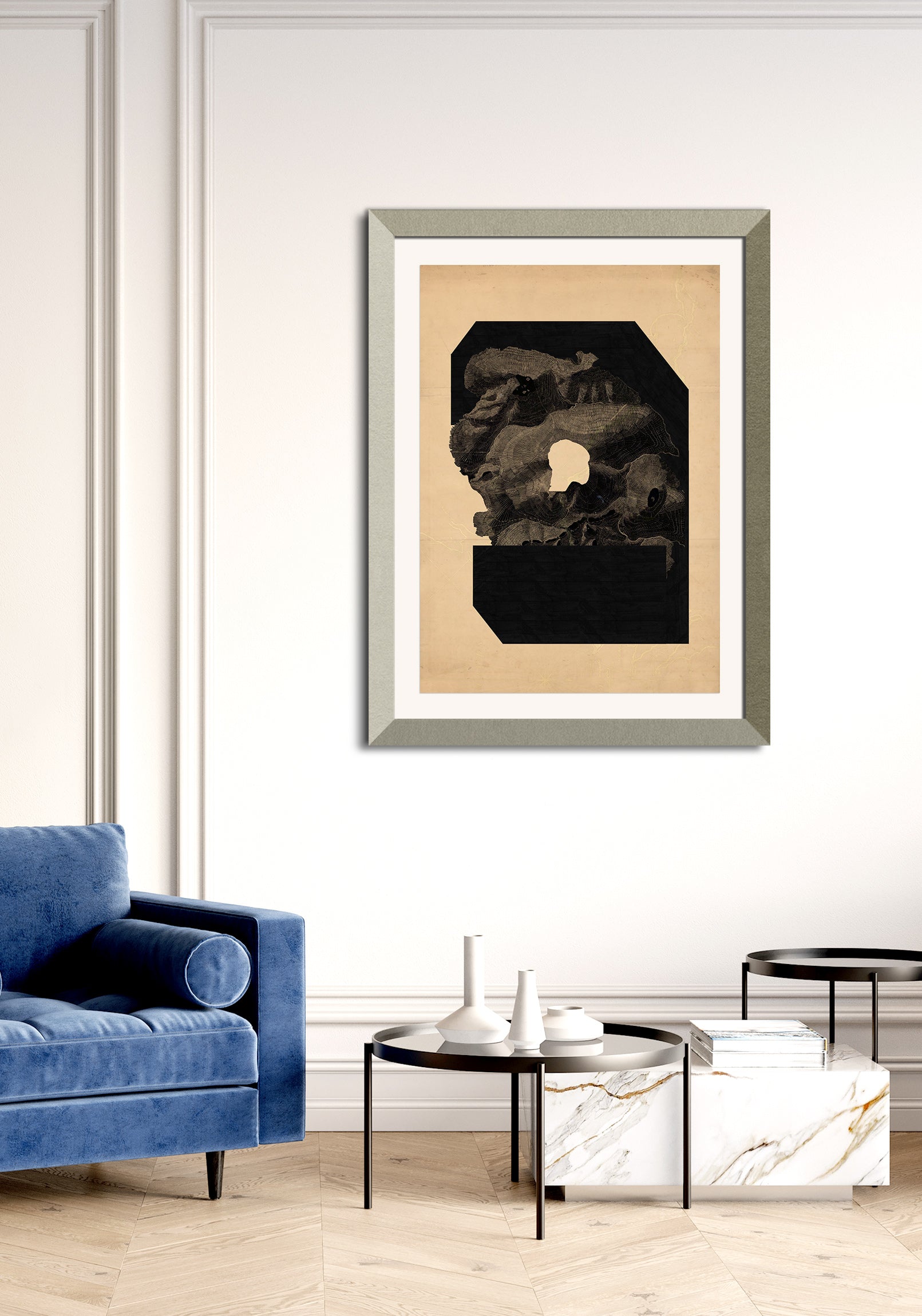 The image with the framed artwork is a simulation to provide a general sense of scale and framing options, suggesting a 10-15cm margin between the artwork and the frame, which could be achieved with a passepartout.