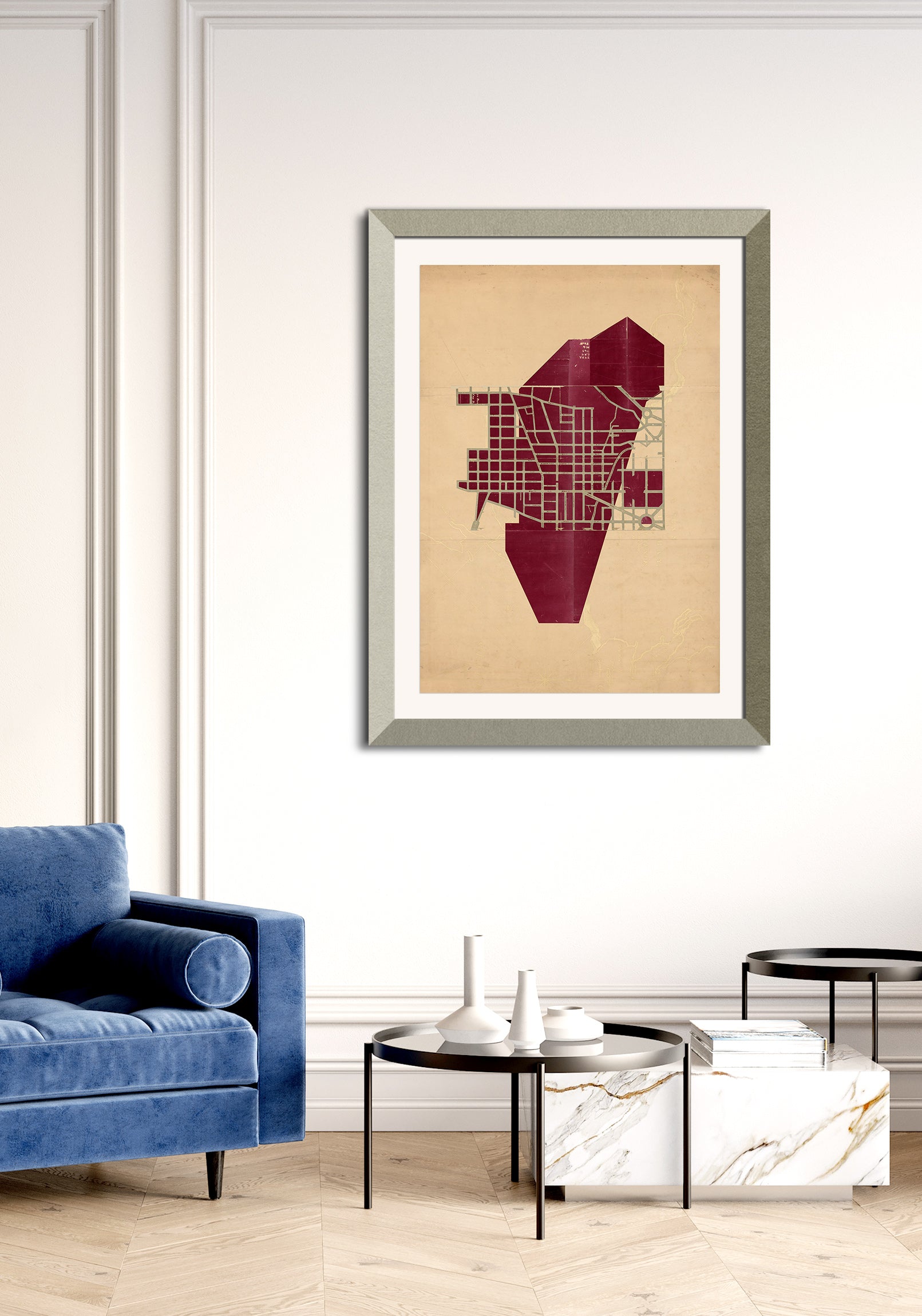 Combined with various textures and graphic elements, the maps take on different levels of prominence in each piece, ranging from subtle background elements to central compositional features.