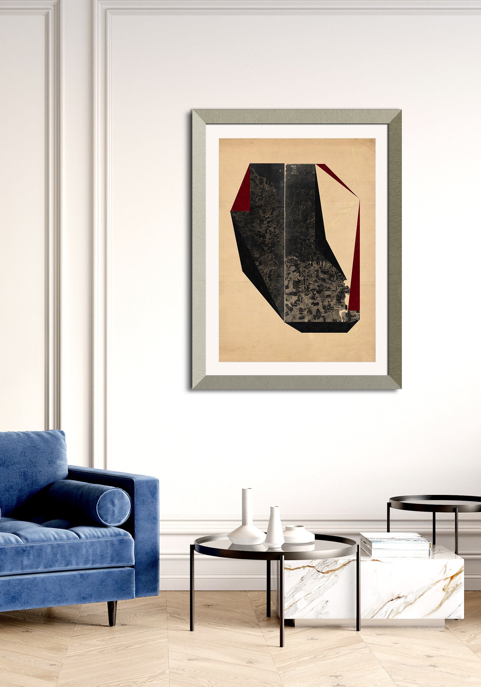 The image with the framed artwork is a simulation to provide a general sense of scale and framing options, suggesting a 10-15cm margin between the artwork and the frame, which could be achieved with a passepartout.