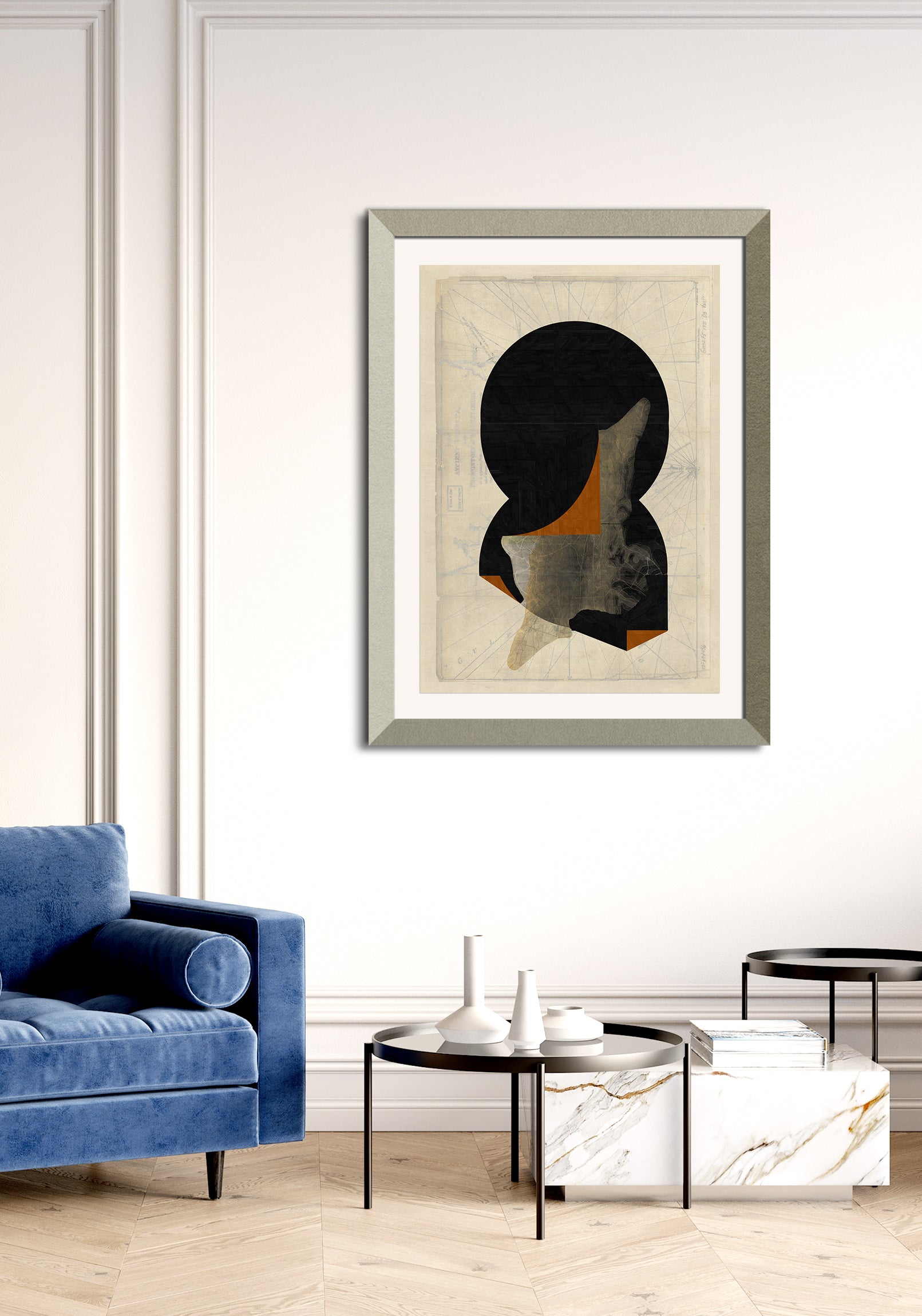 The image with the framed artwork is a simulation to provide a general sense of scale and framing options, suggesting a 10-15cm margin between the artwork and the frame, which could be achieved with a passepartout.