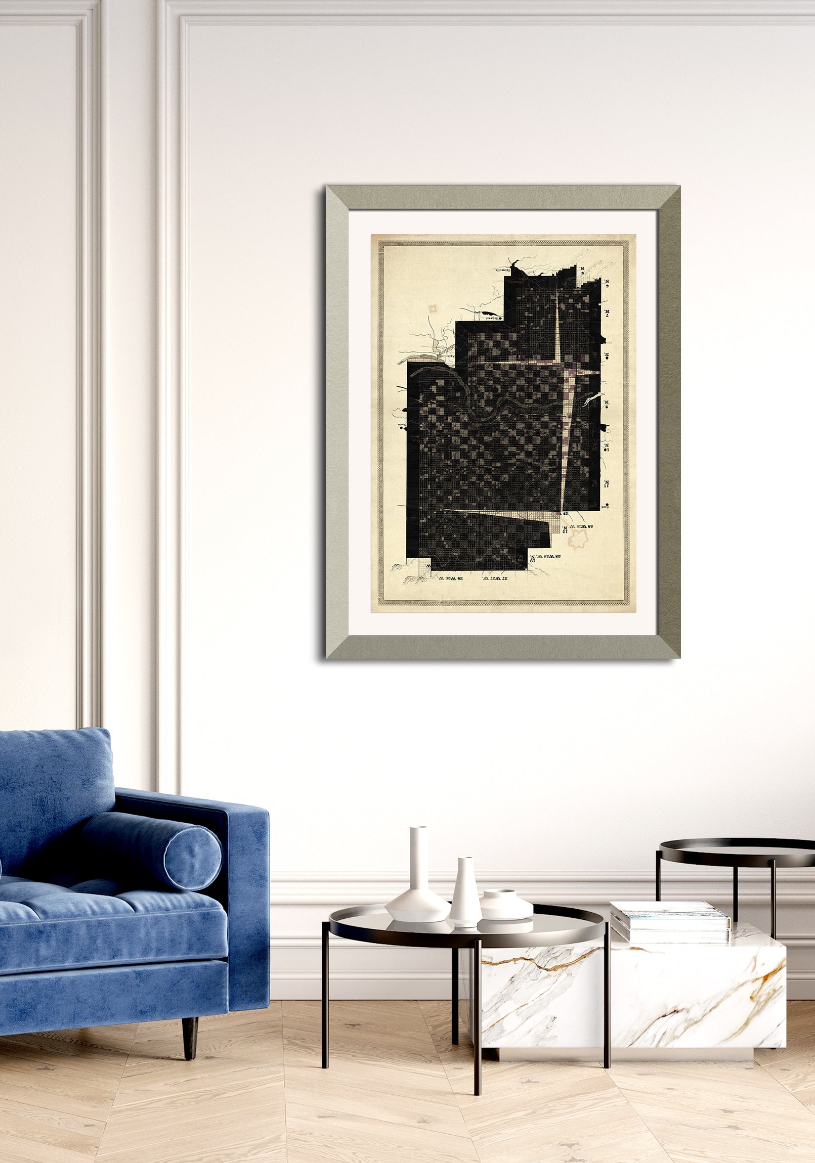 The image with the framed artwork is a simulation to provide a general sense of scale and framing options, suggesting a 10-15cm margin between the artwork and the frame, which could be achieved with a passepartout.