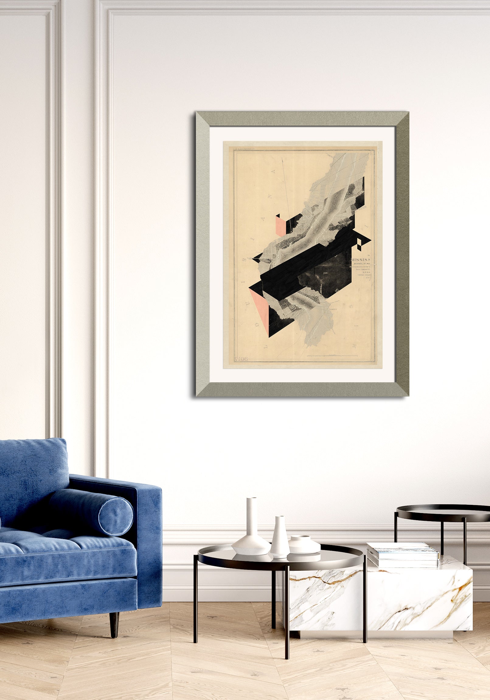 The image with the framed artwork is a simulation to provide a general sense of scale and framing options, suggesting a 10-15cm margin between the artwork and the frame, which could be achieved with a passepartout.