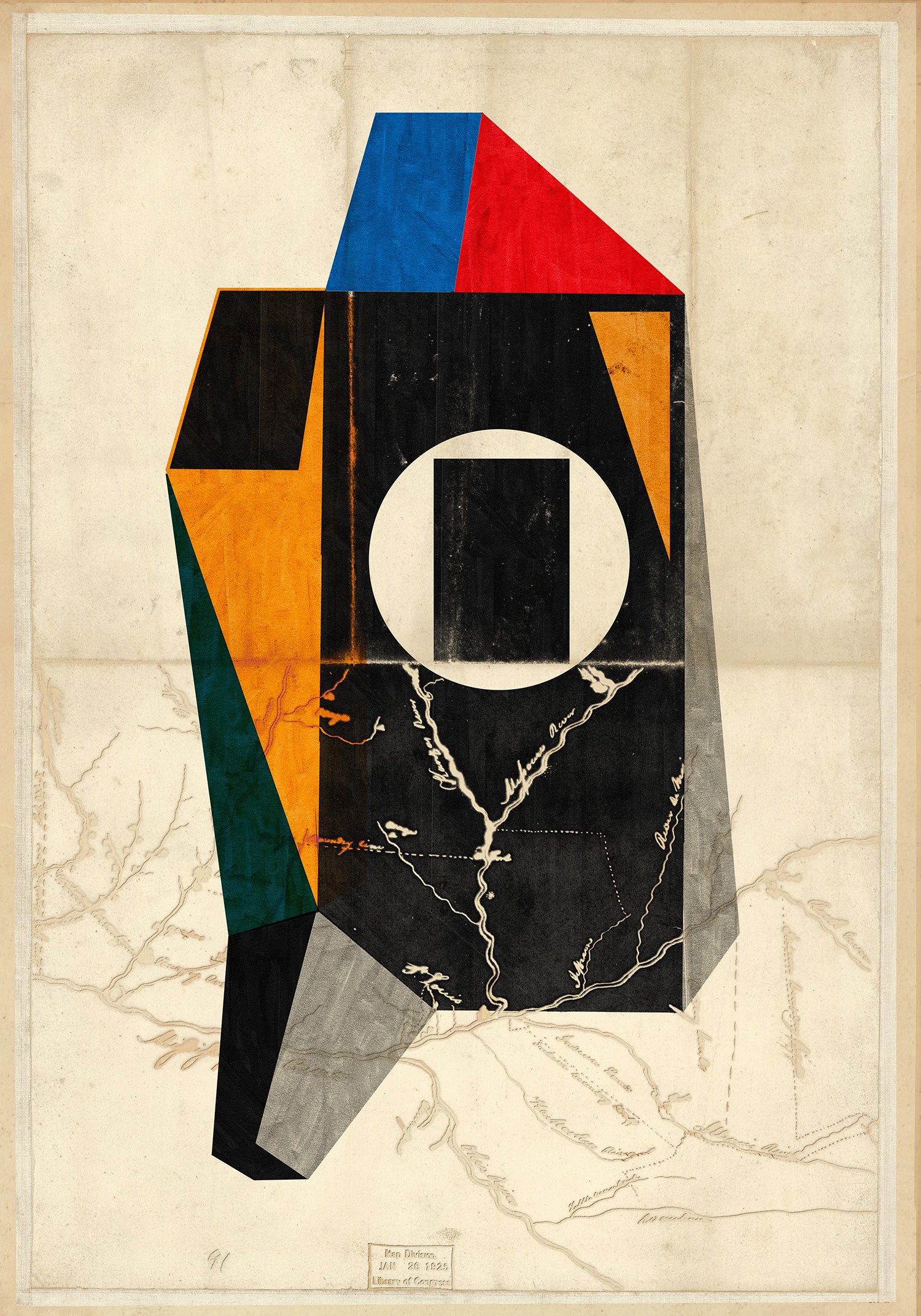 This collection comprises a series of artworks created with digital tools incorporating maps into their compositions.