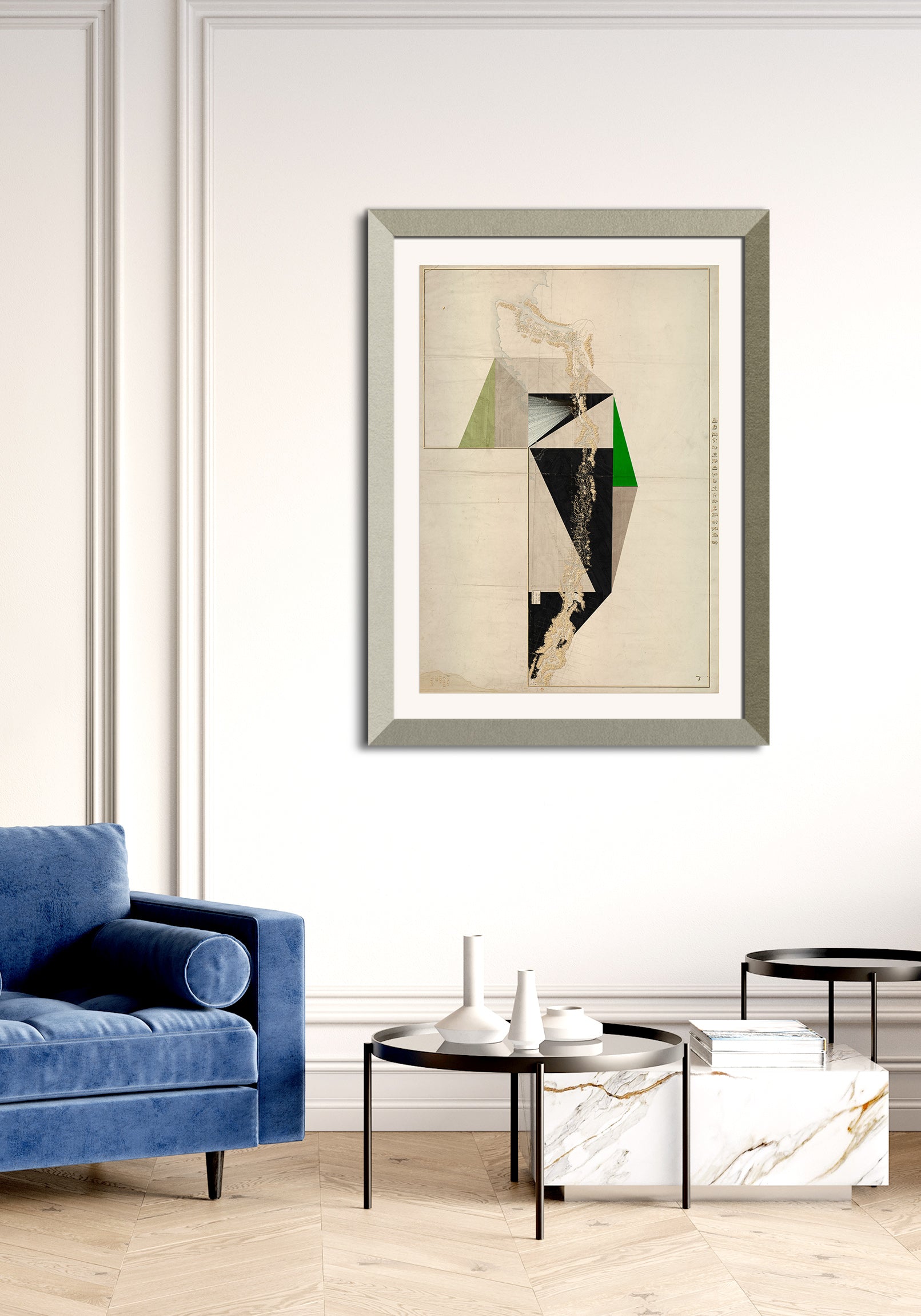 The image with the framed artwork is a simulation to provide a general sense of scale and framing options, suggesting a 10-15cm margin between the artwork and the frame, which could be achieved with a passepartout.