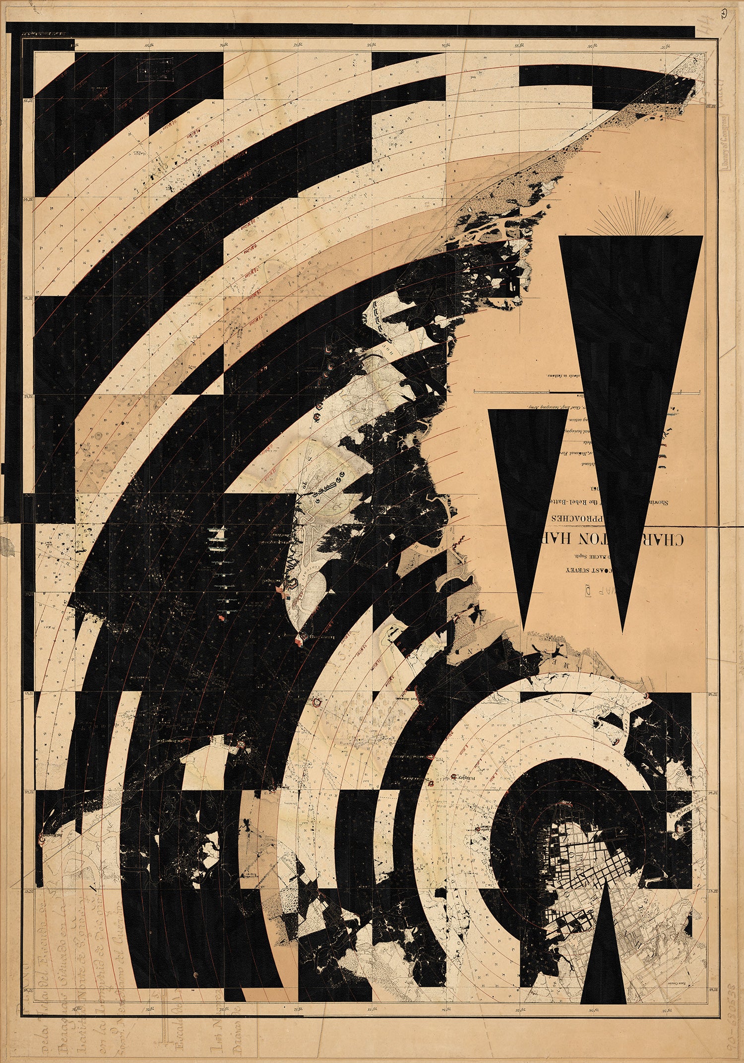 Combined with various textures and graphic elements, the maps take on different levels of prominence in each piece, ranging from subtle background elements to central compositional features.