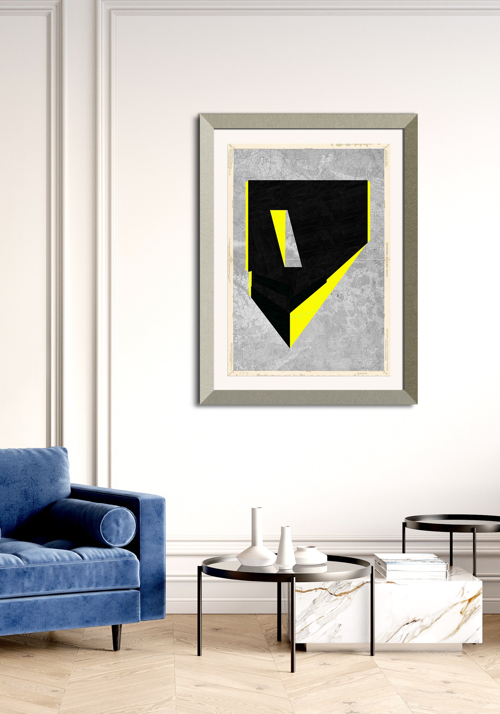 The image with the framed artwork is a simulation to provide a general sense of scale and framing options, suggesting a 10-15cm margin between the artwork and the frame, which could be achieved with a passepartout.