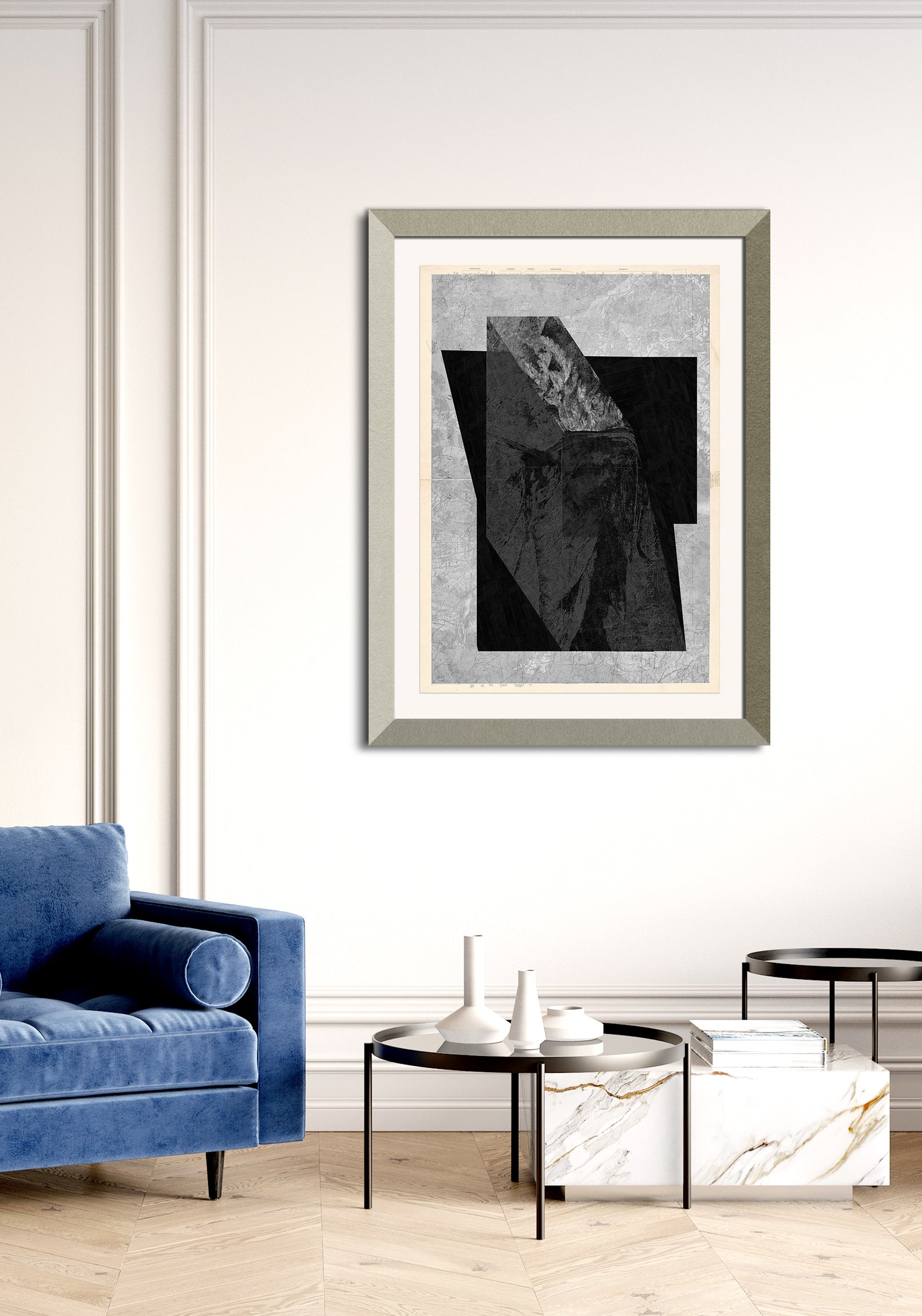 The image with the framed artwork is a simulation to provide a general sense of scale and framing options, suggesting a 10-15cm margin between the artwork and the frame, which could be achieved with a passepartout.