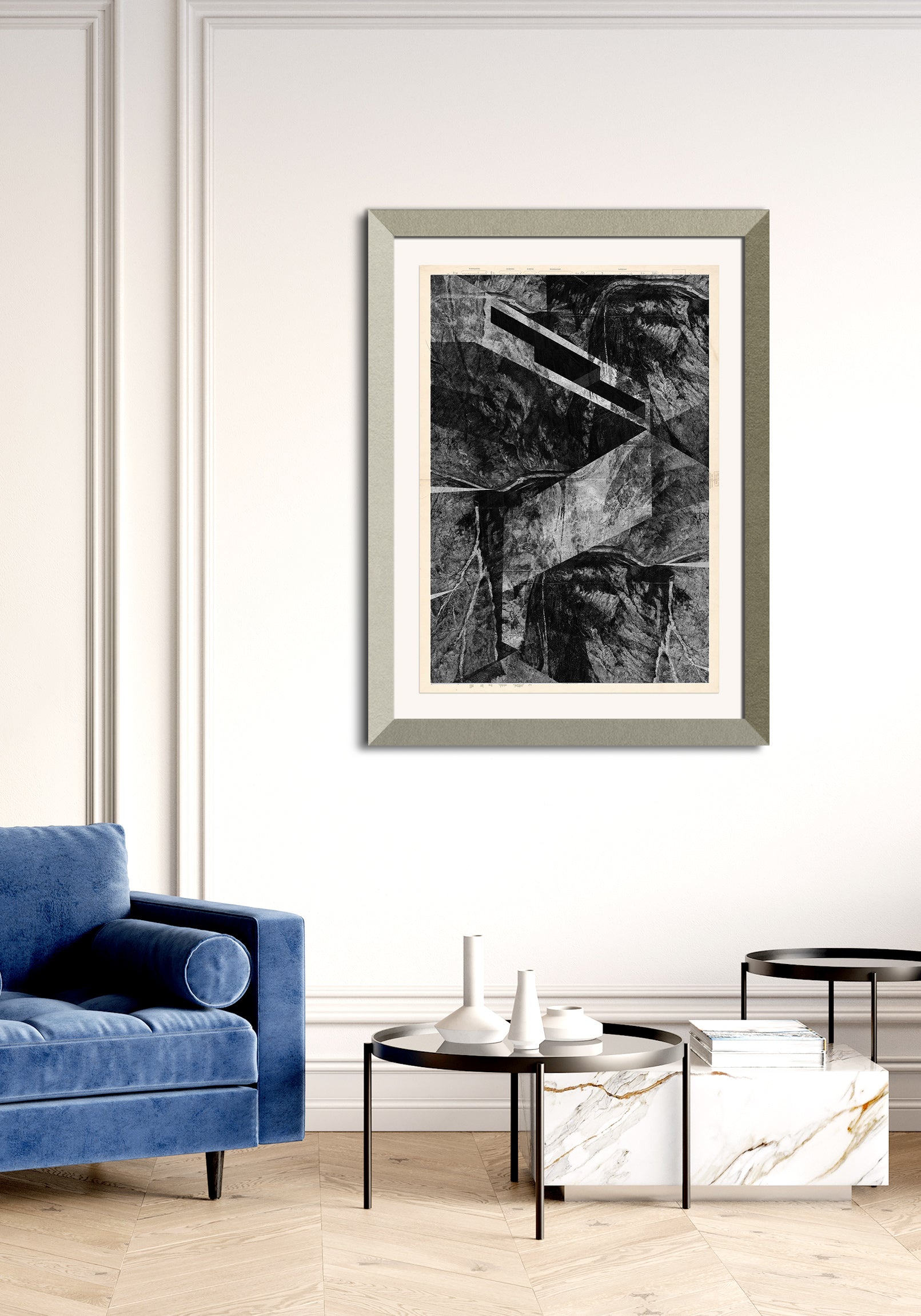 The image with the framed artwork is a simulation to provide a general sense of scale and framing options, suggesting a 10-15cm margin between the artwork and the frame, which could be achieved with a passepartout.