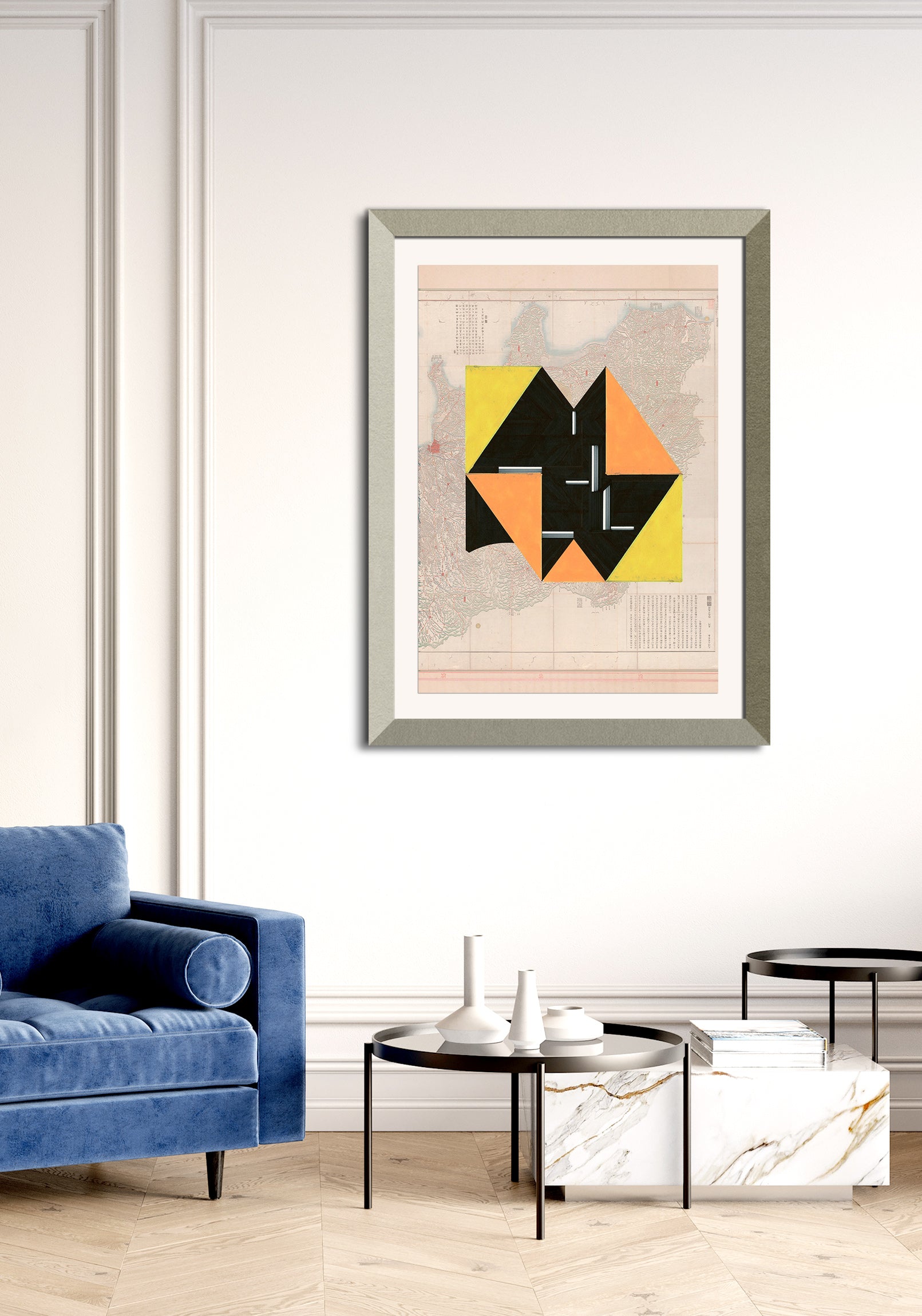 Combined with various textures and graphic elements, the maps take on different levels of prominence in each piece, ranging from subtle background elements to central compositional features.