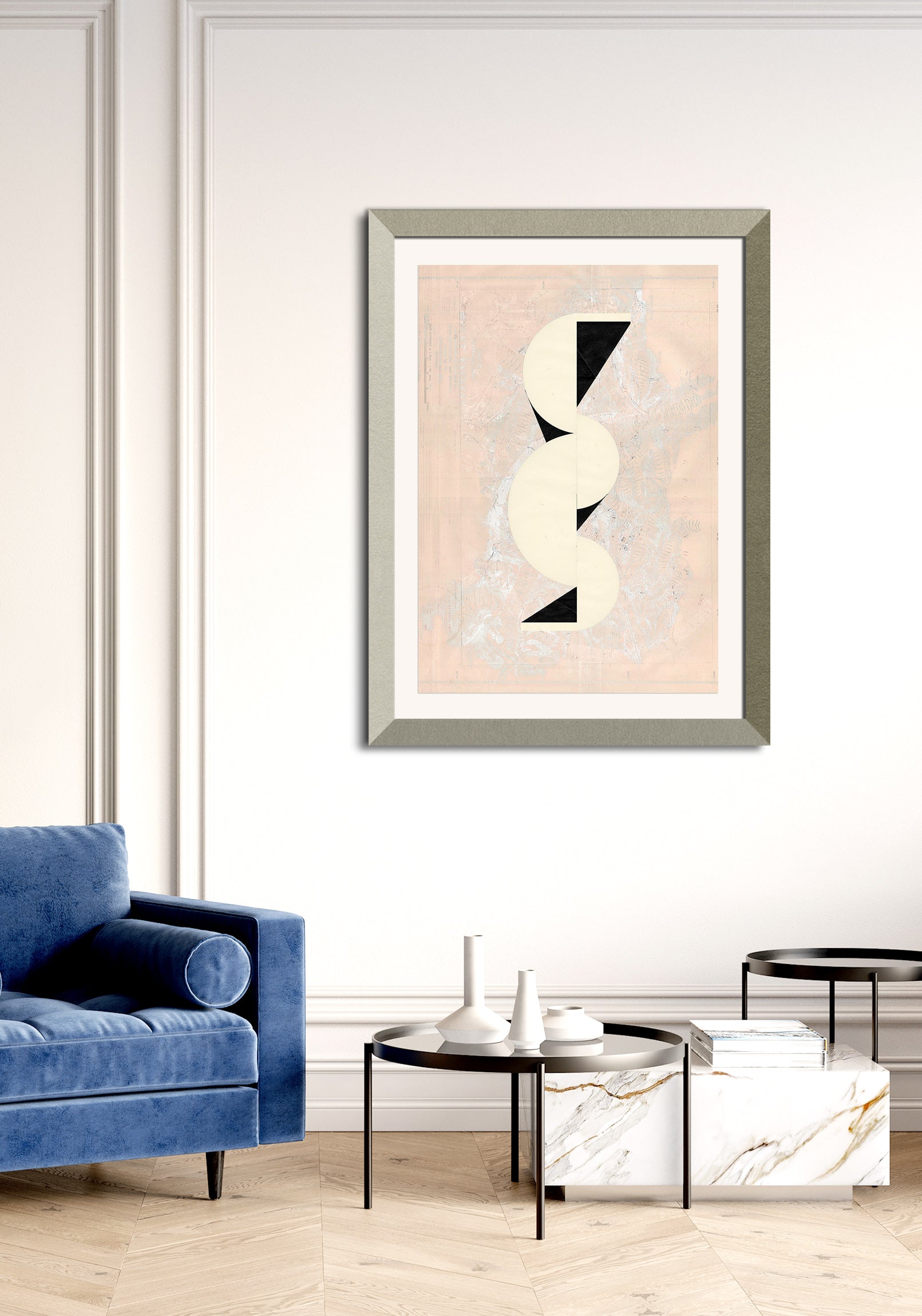 The image with the framed artwork is a simulation to provide a general sense of scale and framing options, suggesting a 10-15cm margin between the artwork and the frame, which could be achieved with a passepartout, or a foam on the background.