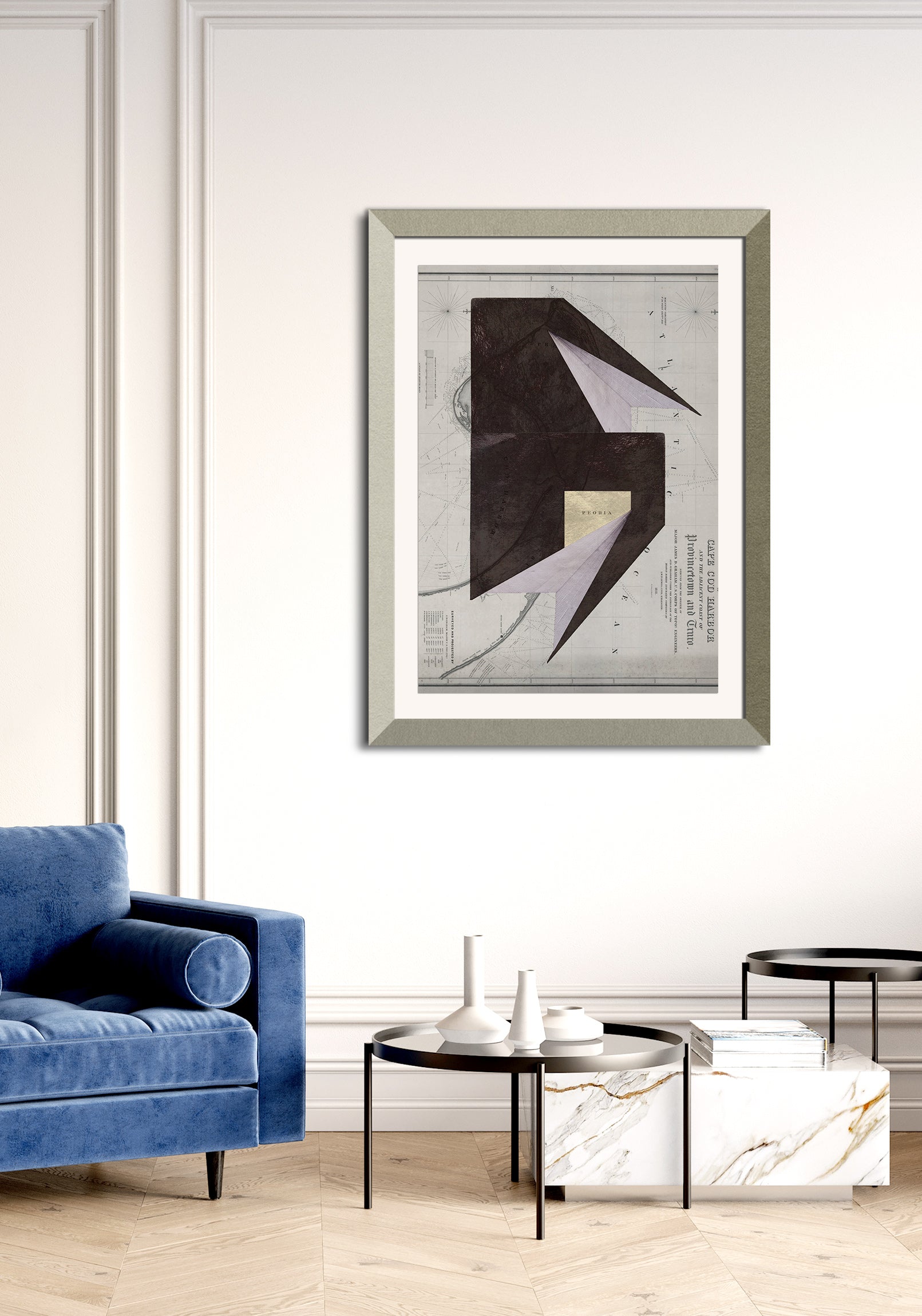 The image with the framed artwork is a simulation to provide a general sense of scale and framing options, suggesting a 10-15cm margin between the artwork and the frame, which could be achieved with a passpartout, or a foam on the background.