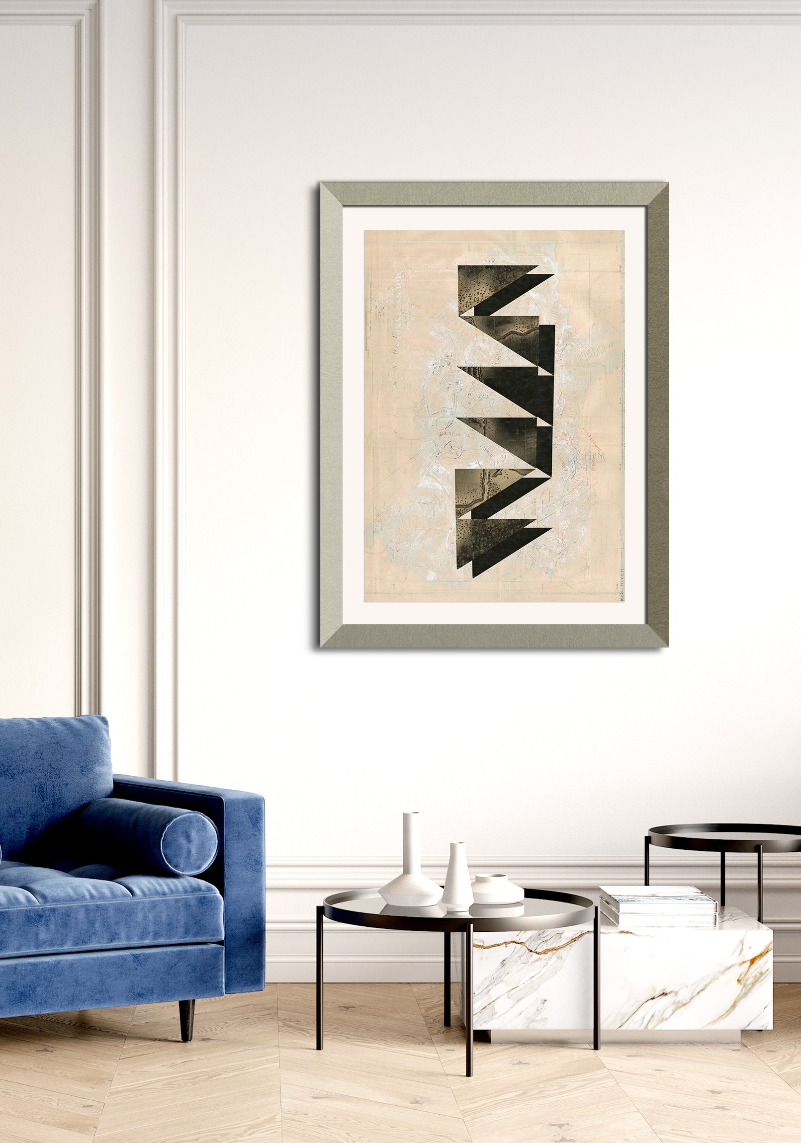 The image with the framed artwork is a simulation to provide a general sense of scale and framing options, suggesting a 10-15cm margin between the artwork and the frame, which could be achieved with a passepartout, or a foam on the background.