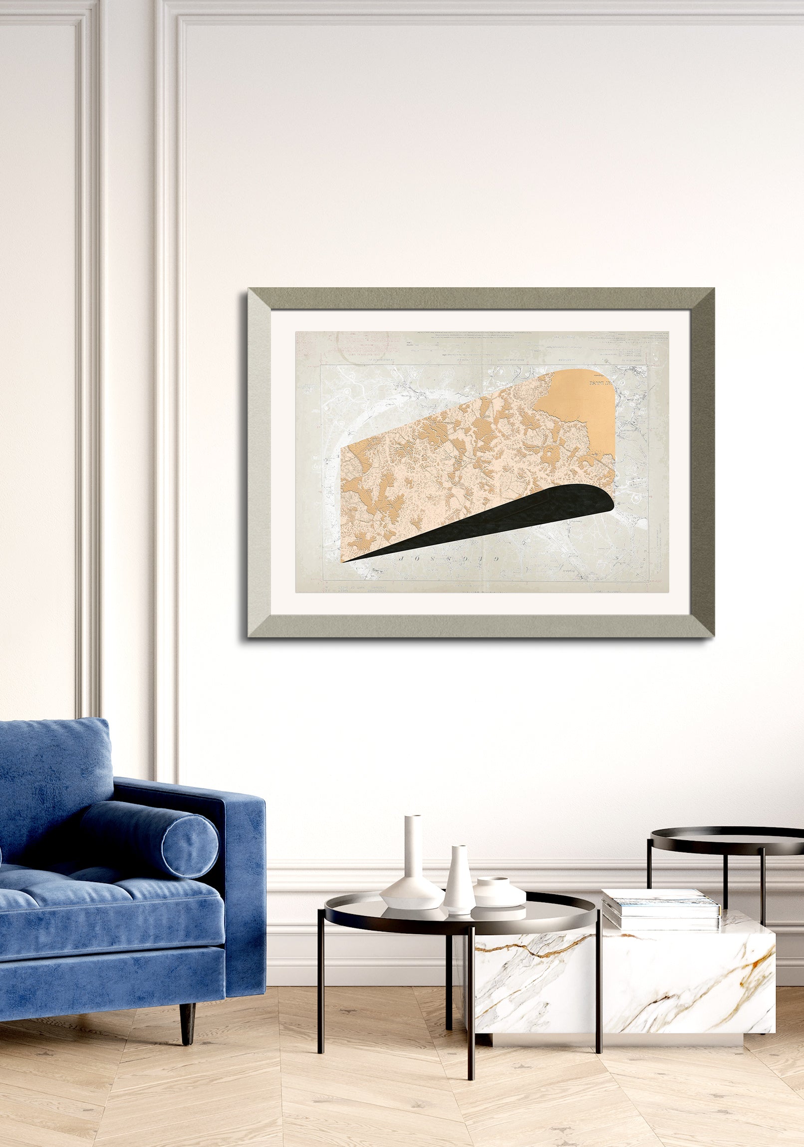 The image with the framed artwork is a simulation to provide a general sense of scale and framing options, suggesting a 10-15cm margin between the artwork and the frame, which could be achieved with a passepartout, or a foam on the background.