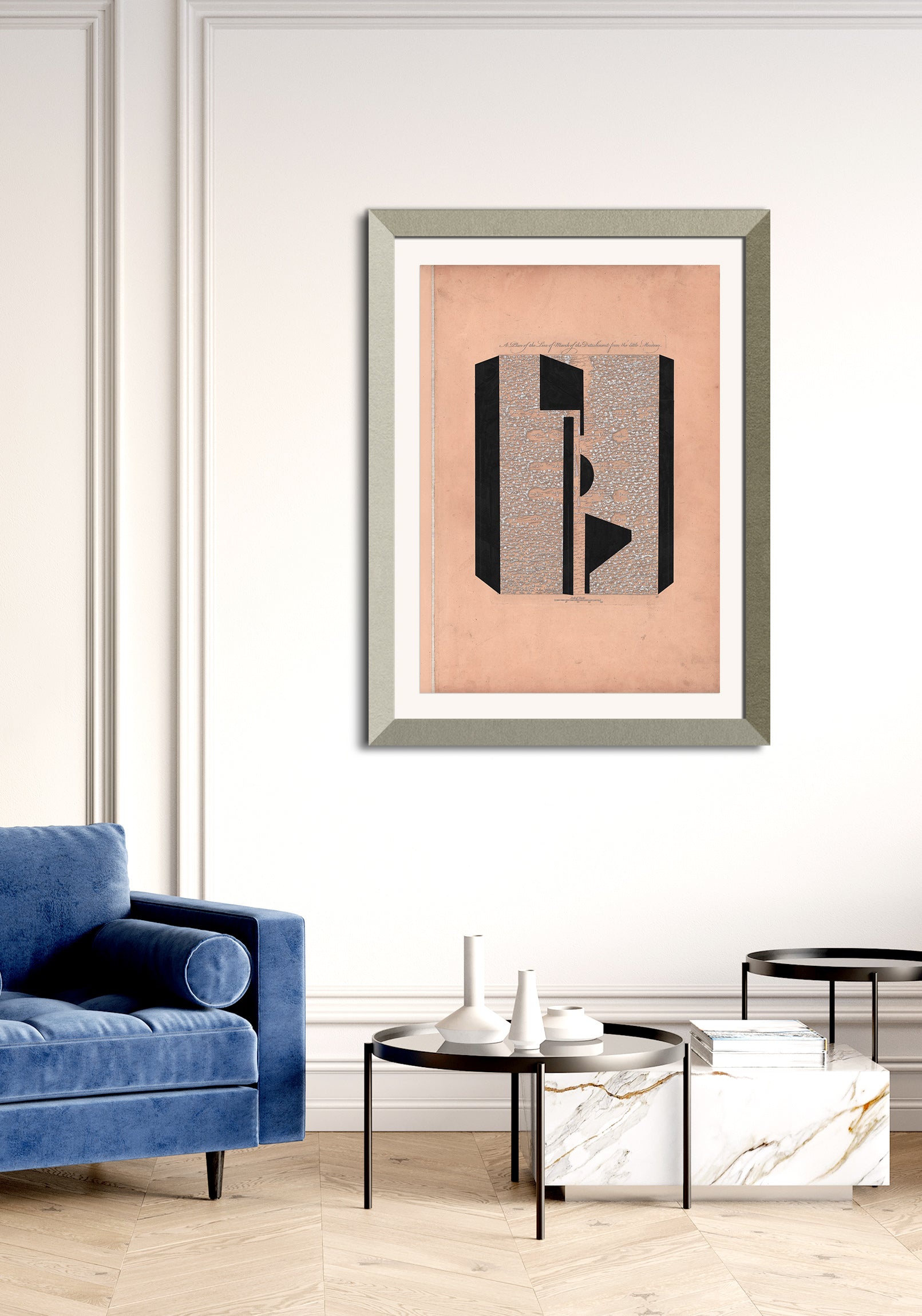 The image with the framed artwork is a simulation to provide a general sense of scale and framing options, suggesting a 10-15cm margin between the artwork and the frame, which could be achieved with a passepartout, or a foam on the background.