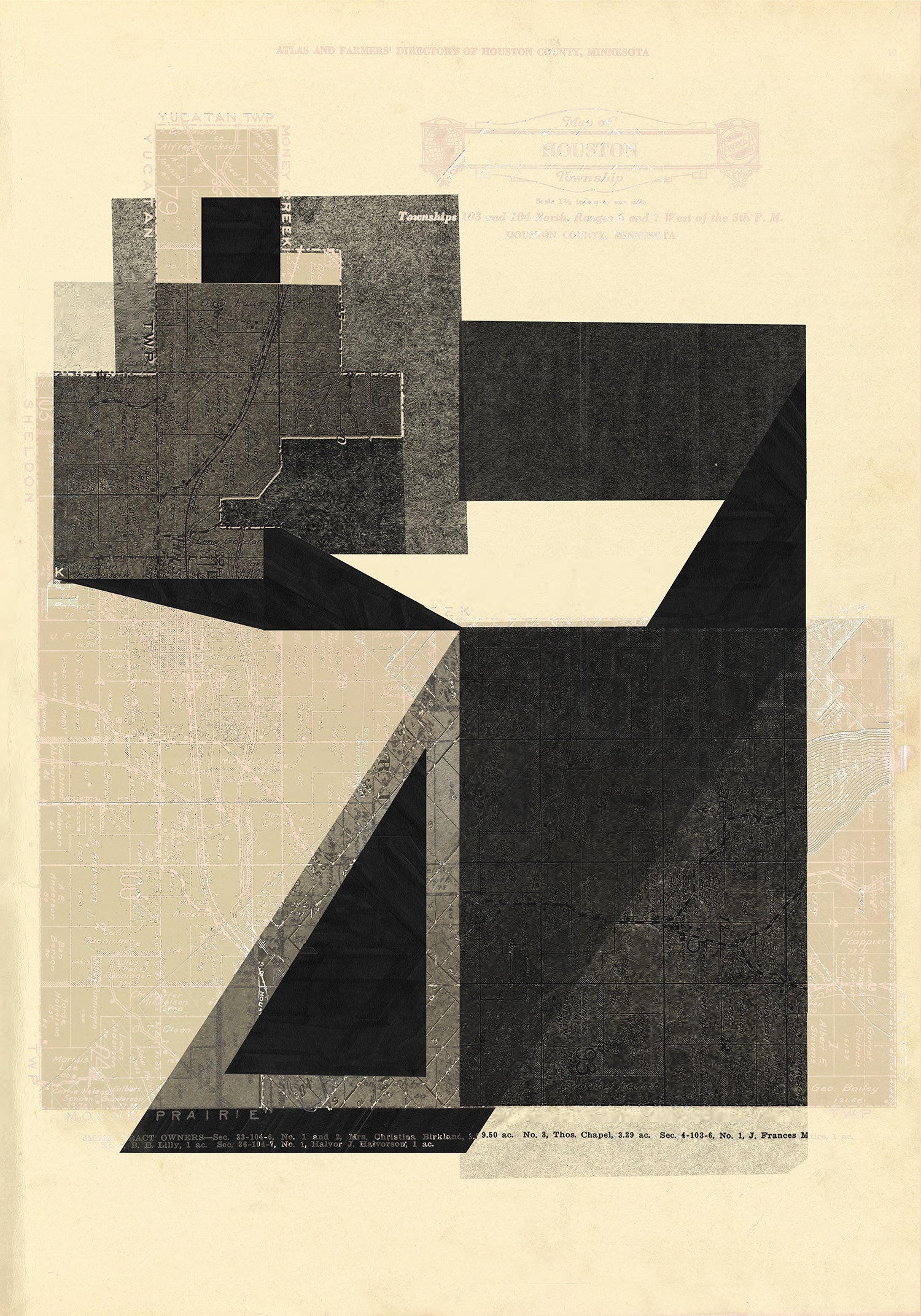 Combined with various textures and graphic elements, the maps take on different levels of prominence in each piece, ranging from subtle background elements to central compositional features.
