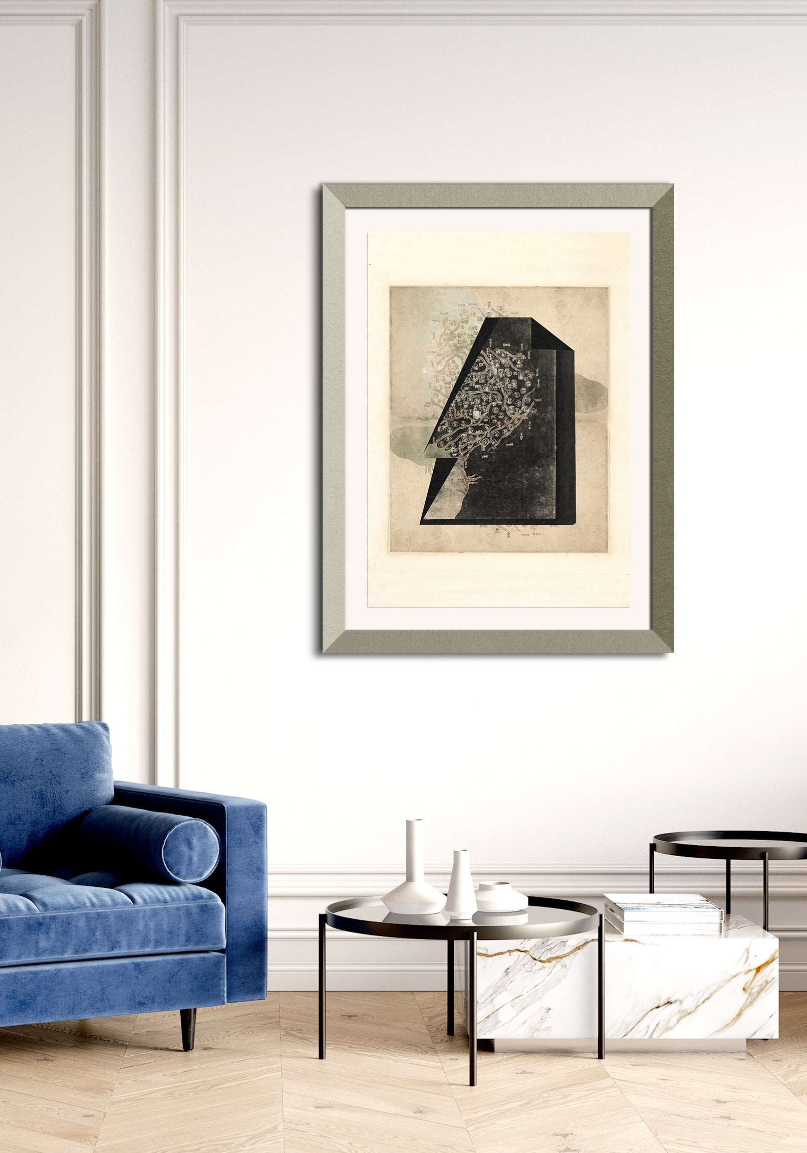 The image with the framed artwork is a simulation to provide a general sense of scale and framing options, suggesting a 10-15cm margin between the artwork and the frame, which could be achieved with a passepartout.