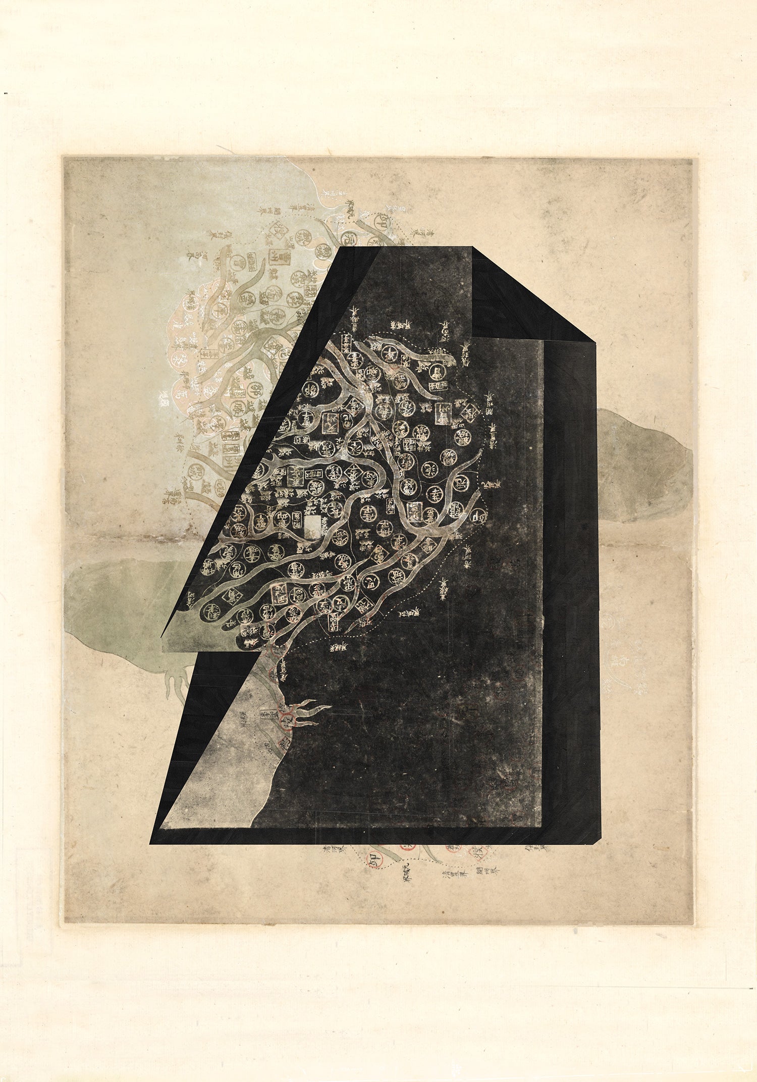 Combined with various textures and graphic elements, the maps take on different levels of prominence in each piece, ranging from subtle background elements to central compositional features.