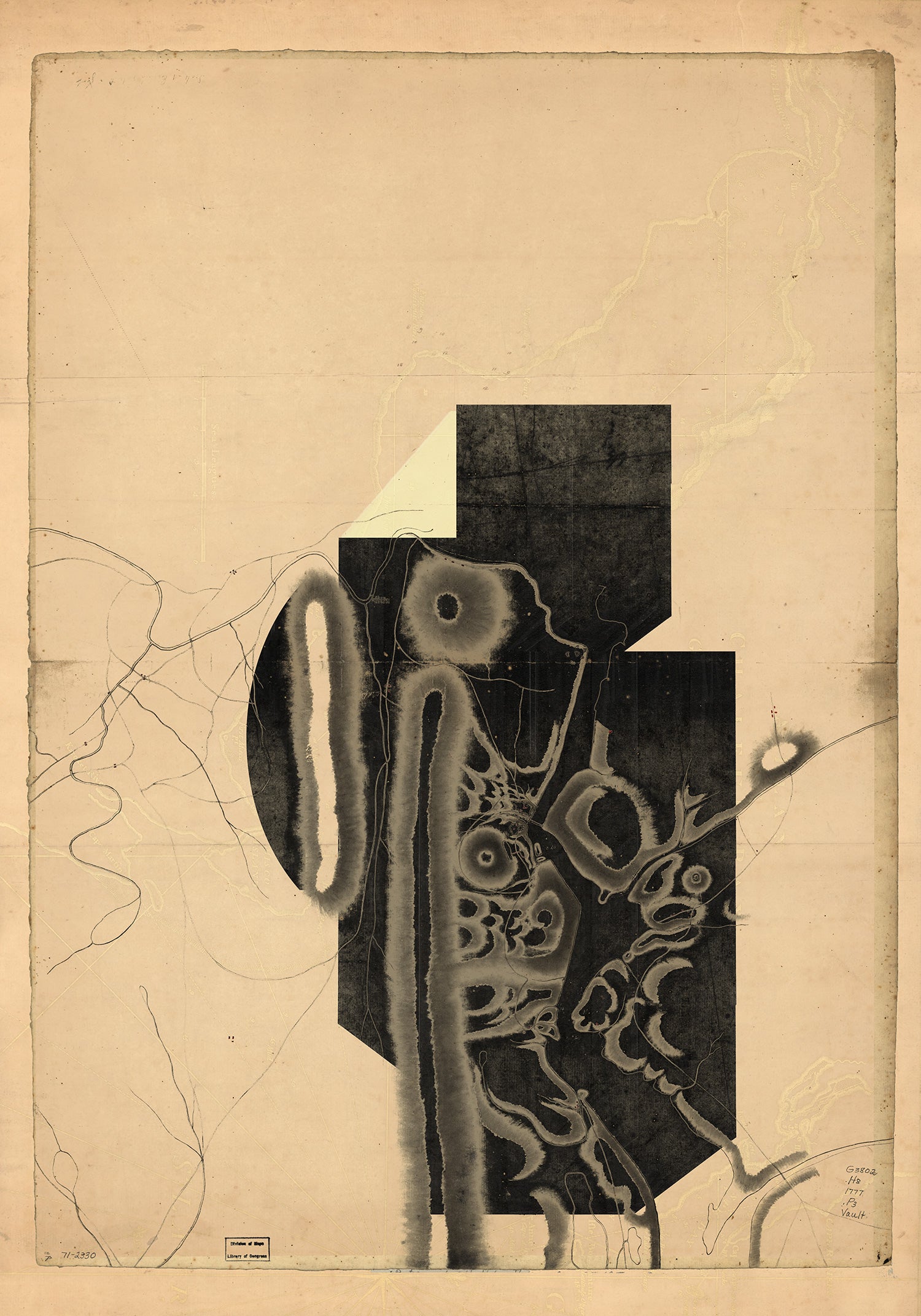This collection comprises a series of artworks created with digital tools incorporating maps into their compositions.